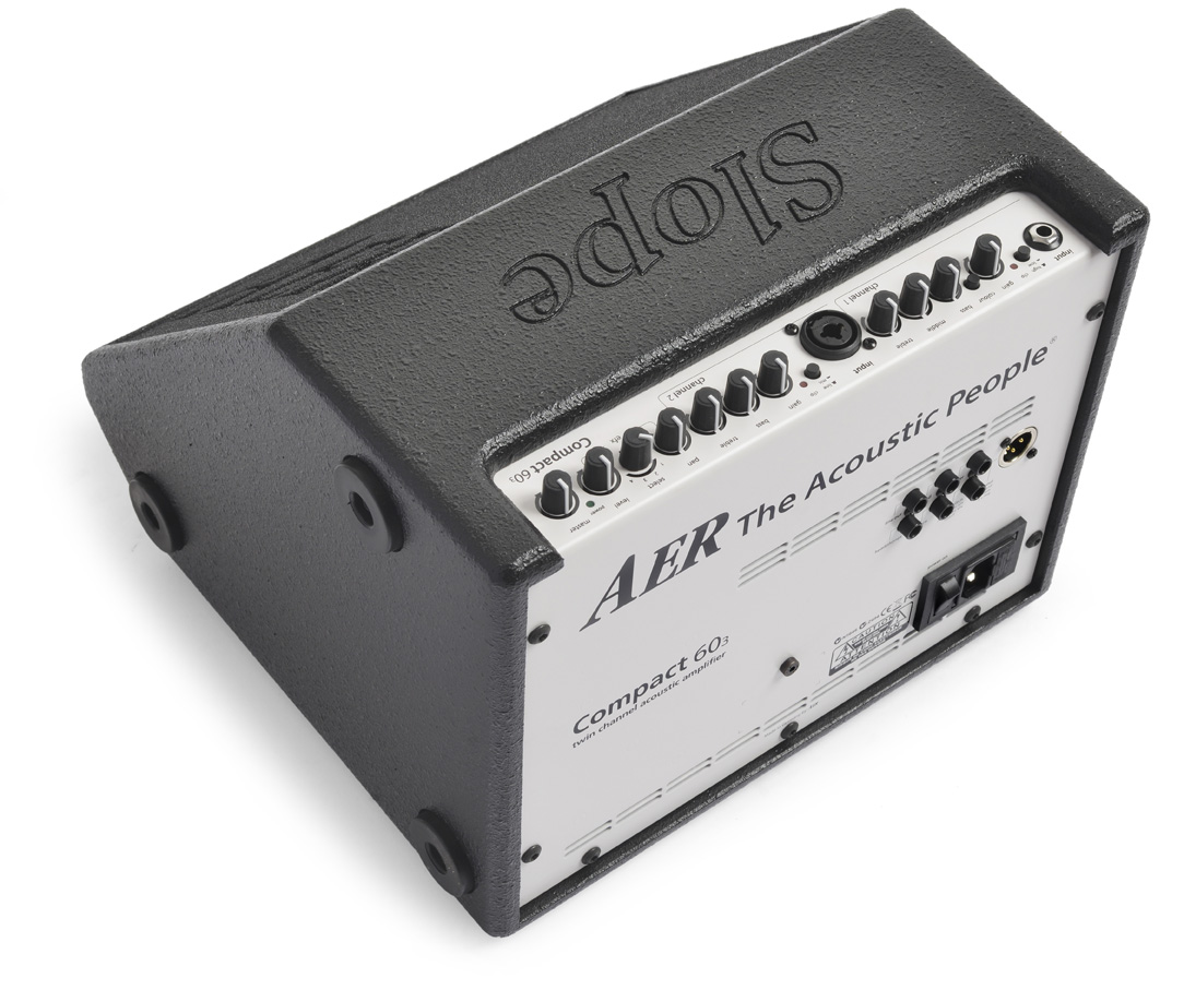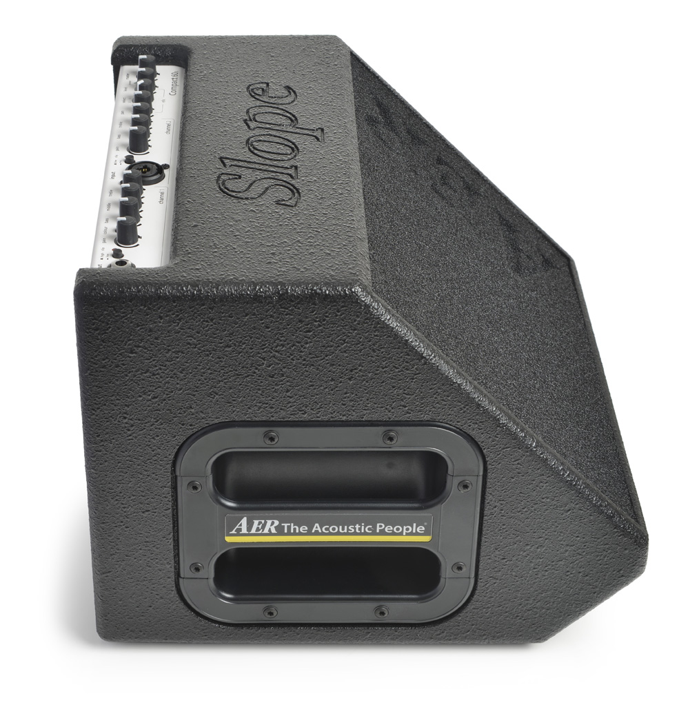 The AER Compact Slope is a 60W, 2 channel amplifier for voice and electric-acoustic instruments. Each channel features gain and 3-band EQ controls, with a jack input on channel 1 with High/Low switch and Contour button, while channel 2 offers an XLR/ 1/4” jack input to connect a microphone. You’ll also find on the control panel a master knob and an effect section with 2 reverbs, delay, chorus and a pan control.