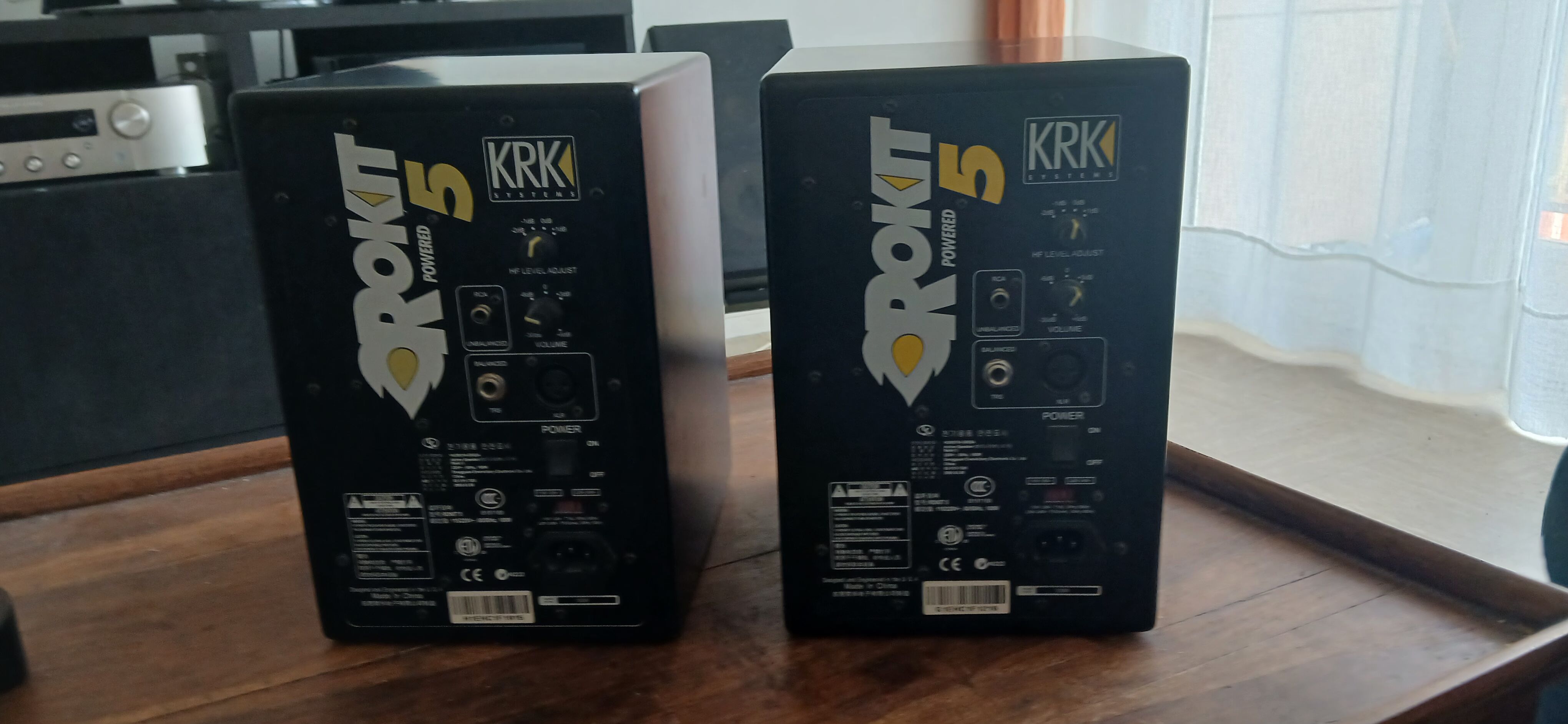 The KRK RP-5 Rokit Monitors are nice. The sound is extremely clear and natural. When you crank it there is no white noise that creeps. Great low ends and the highs are heavenly. Frequency adjustments on the back for tuning perfectionists. Good bang for buck. However. If you're rocking out hiphop or rap or anything with a boom it'll distort when its loud. If you forget to turn them off after using them they'll pop when you reboot the PC. If you put your cell phone or any wireless device on top of them they pop and make weird noises. Other than that they've been a great addition to the studio.