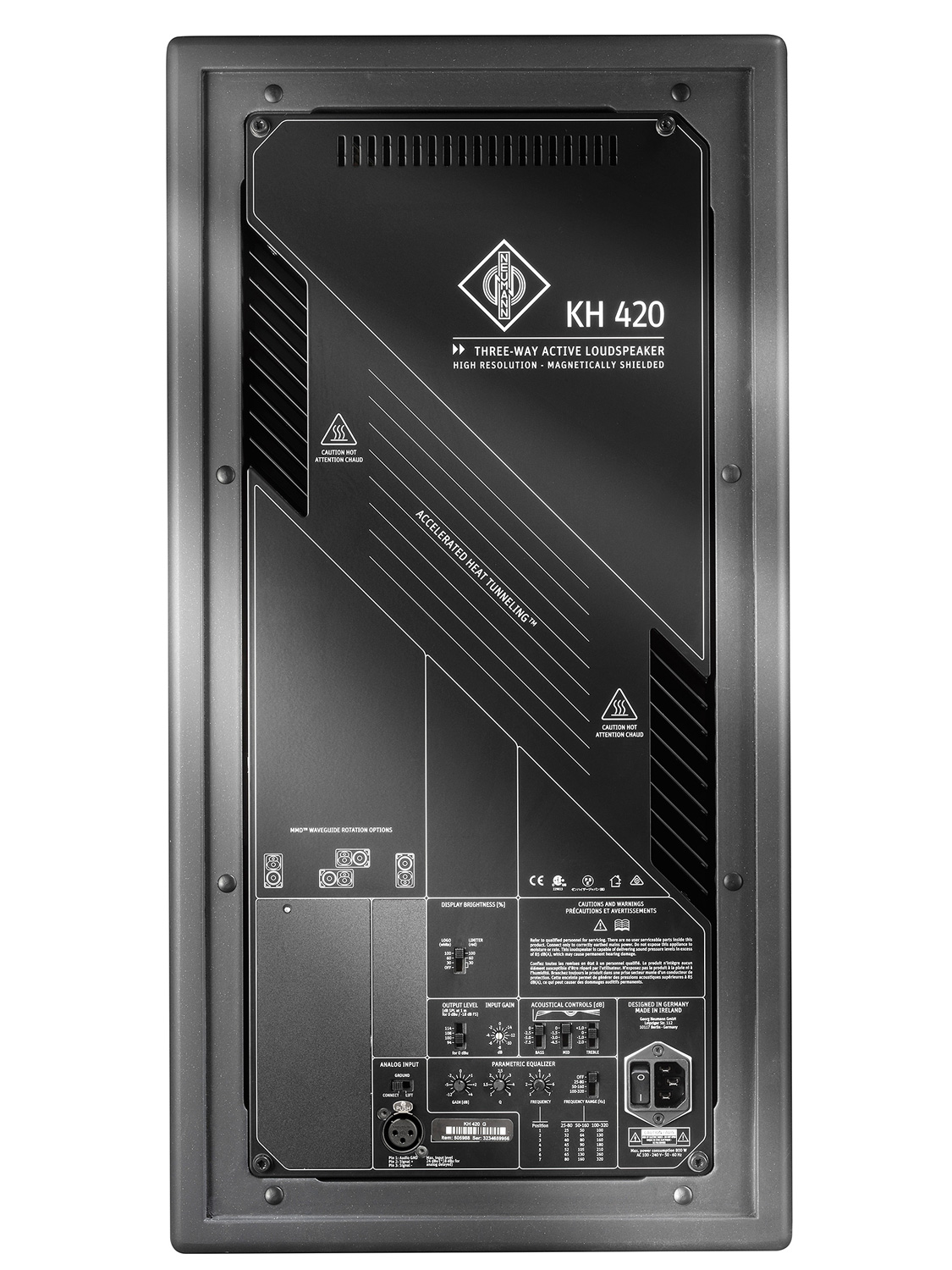 The KH 420 features an MMD (Mathematically Modeled Dispersion) rotating waveguide, acoustic controls and you can add the optional DIM 1 (Digital Input Module) which includes AES3 and S/PDIF digital inputs as well as the delay feature mentioned above.