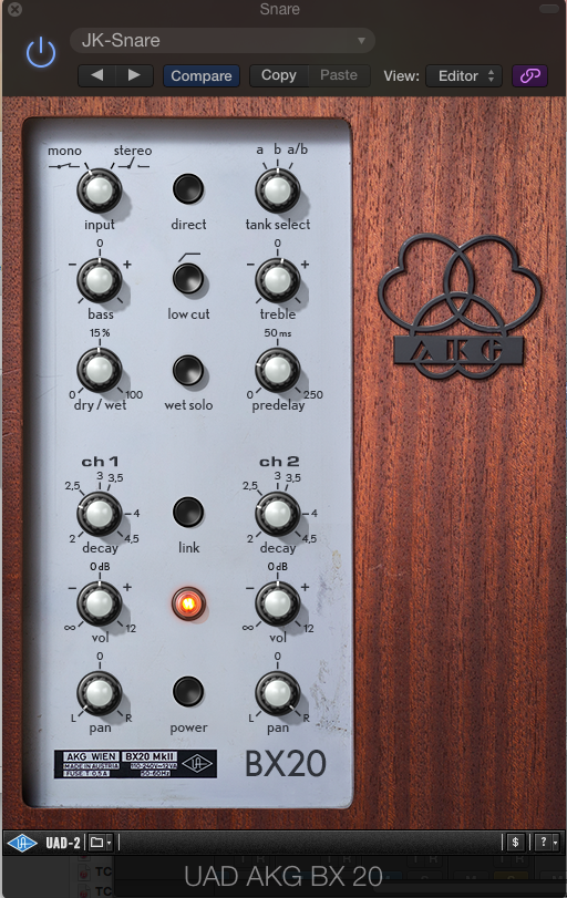 The plug-in version is based on the AKG BX20E1, a tall, wood encased outboard spring reverb unit from the analog era with a reputation for warm and dark sounds. According to Universal Audio, the AKG BX 20 plug-in is not strictly a convolution or algorithmic reverb, but instead a hybrid, which also employs an “advanced delay network” that models the original unit’s two-stage delay.
