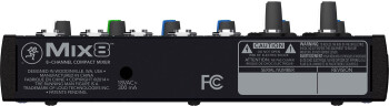 - Mix8: 2 XLR and 1/4” mic/line inputs with mic preamps and phantom power, pano, level and clipping indicator ; 2 line inputs ; 3-band EQ on each channel, aux send with stereo returns, RCA inputs and outputs, L/R main outputs, headphone and stereo Control Room outputs. US pricing: $109.99