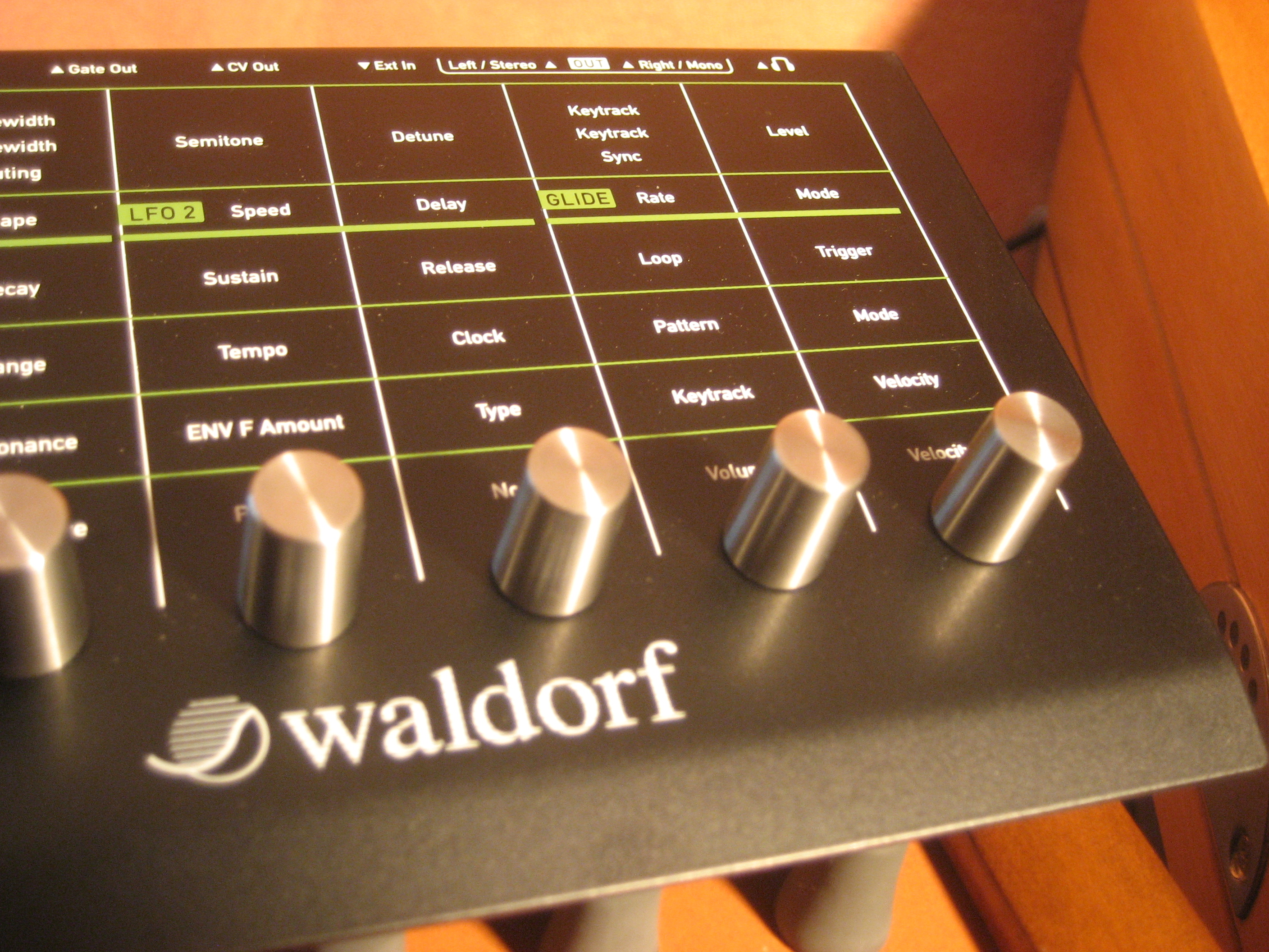 We asked Waldorf if certain parameters could benefit from a finer resolution with the encoders or MIDI (for example with 14 bits like a Moog): it depends on the return of the clients, knowing that the maximum resolution is preserved via the modulation matrix. This problem doesn’t exist with the CV/Gate outputs that we can use to control pure analog synths. They actually feature a 14-bit DAC to convert the digital modulations into CV. CV works in Volt/Octave or Hertz/Volt, which allows us to work with most antiques. CV transmits Pitch (notes + arpeggiated notes, awesome!), a unipolar voltage (useful, for example, for a modulation created from an envelope) or a bipolar voltage (modulation stemming from an LFO). The output voltage can be adjusted for both the CV (slope + fixed voltage) and the Gate (0 or 3.3 V polarity). Thus, the Pulse 2 does the job of a MIDI – CV/Gate interface for the same price, bravo!