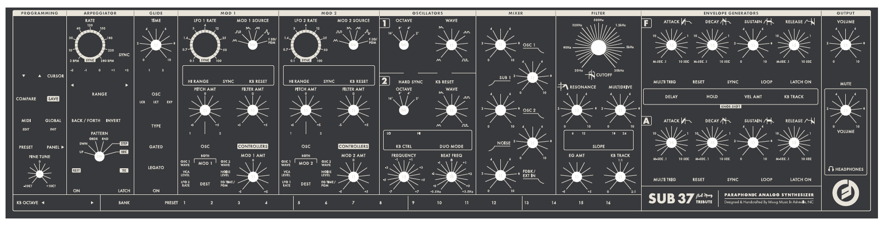 What we can see on the visual posted yesterday is that the SUB 37 Bob Moog Tribute is an analog paraphonic synth that features dual oscillators, dual LFO, dual ADSR envelope generators, glide, filter with resonance, an arpeggiator and it will be possible to store presets.
