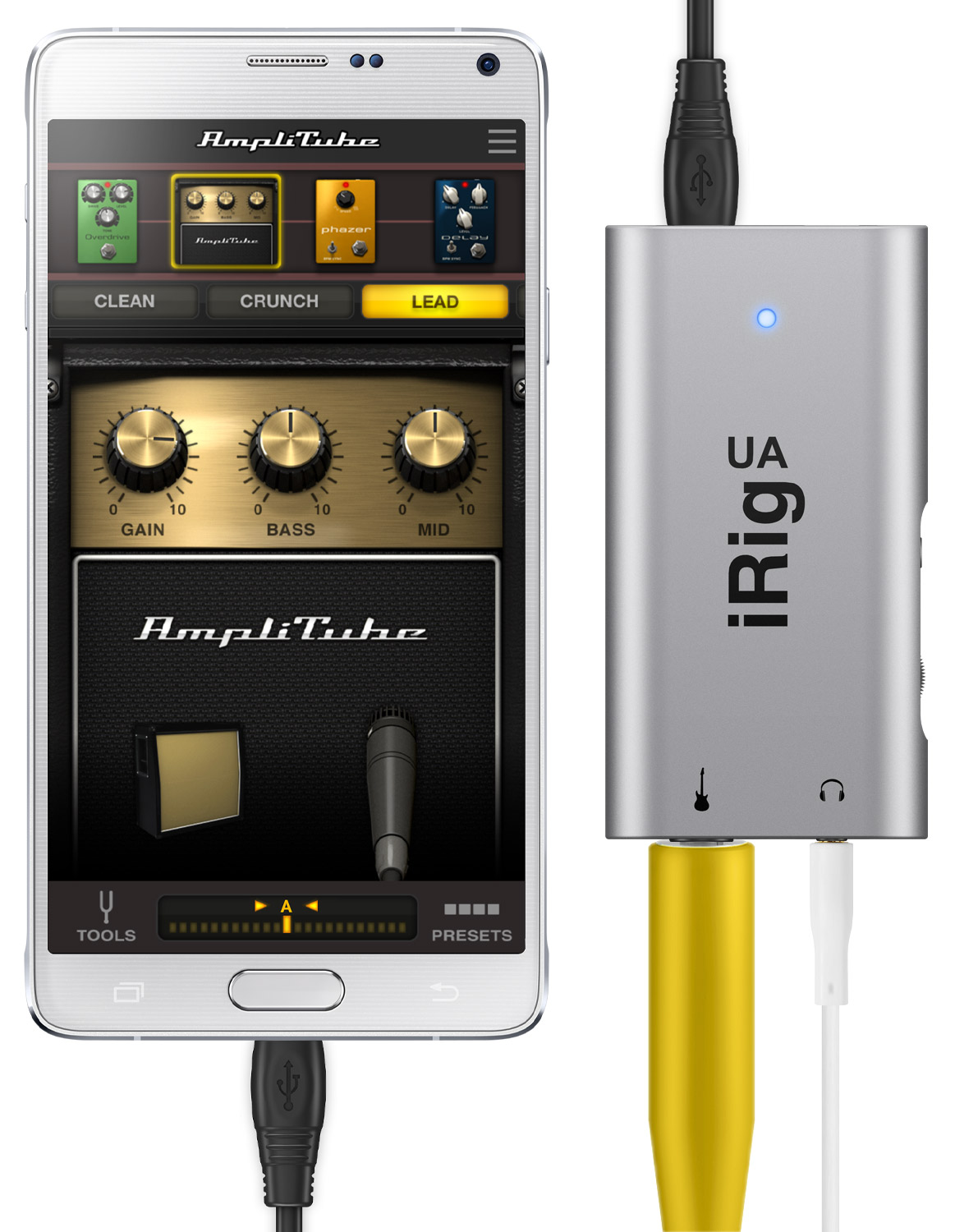 The iRig UA is the first IK Multimedia universal interface for guitar that can be used with any smartphone and tablet running Android 4.0 and later and compatible with the USB/OTG modes (Samsung, Sony, LG, Motorola, HTC, Xiaomi…).