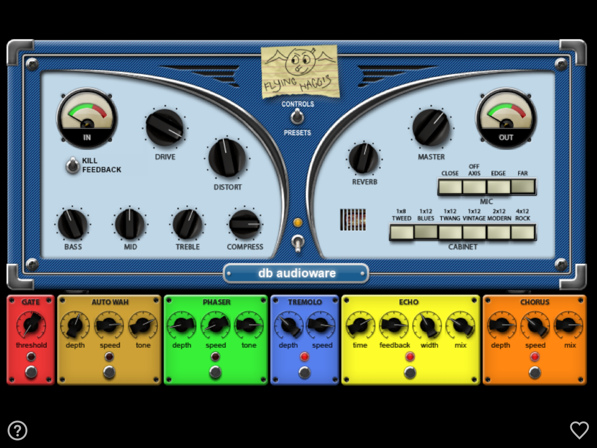 Although it doesn’t have nearly the feature set of some of the other apps in this story, there’s something I really like about the vibe of Flying Haggis. Originally a Mac/PC plug-in, db audioware brought it over intact to the iPad platform. It’s got a colorful interface with all six of its effects always visible. It has just one amp model, but you can change it quite a bit with the preamp controls, which include Bass, Mid, Treble, Compress, Distort and Drive. Also on the amp portion of the interface is a master volume, reverb control, four different mic placement choices (you can’t change virtual mics), and six different cabinet models including 1×8 Tweed, 1×12 Blues, 1×12 Twang, 1×12 Vintage, 2×12 Modern, and 4×12 Rock.