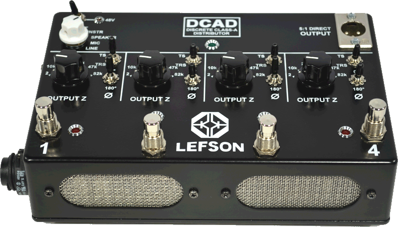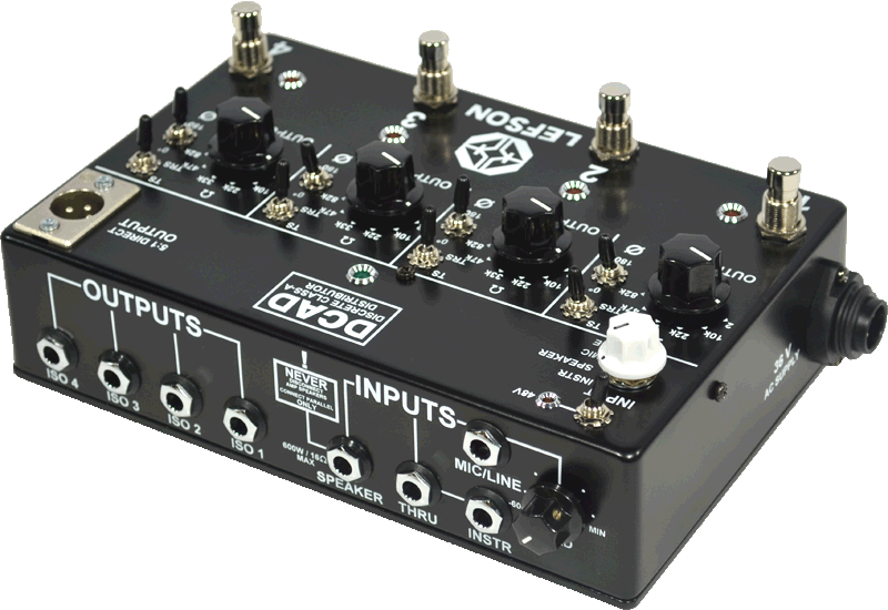 The DCAD features a mic/line input with dedicated level knob, as well as instrument and speaker inputs (600W / 16 Ohms max for the speaker input). 4 jack outputs are also available with their respective active circuit and a DI output with XLR connector is available on the front panel. A Thru connection is directly connected in parallel to the Instrument input. Lefson adds that the mic/line input and the five active inputs isolated using Lundahl transformers.