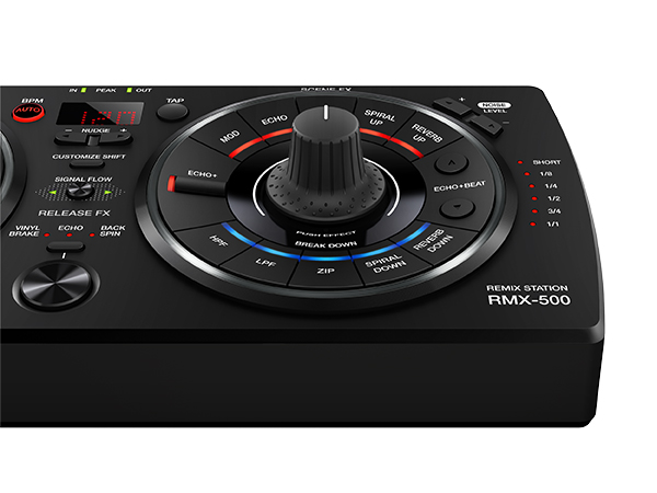 The Pioneer RMX 500 features three effect sections: Rhythm FX includes Roll, Trans, Add, Rev Delay and Offset effects and you will find in the center of the control section a large pressure sensitive knob (via push), as well as five Instrument buttons for kick, snare, clap, hi-hats and cymbal. Each instruments comprises six different patterns that can be added via a button. A 4-beat sequencer with overdub function is also included.