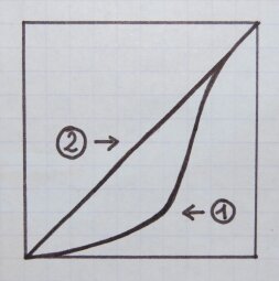 Curve 1 represents the slope of a logarithmic pot and curve 2 that of a linear one, with the action on the pot on the horizontal axis and the quantity of the signal delivered on the vertical axis.