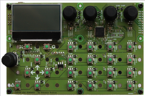 - The Axoloti Control is another board equipped with a 128 × 64 pixel monochrome LCD display, navigation buttons, one endless rotary encoder for value adjustment and four « channel strips », each with an endless rotatif encoder, three status LEDs and a push button with LED, as well as an STM32F1 micro-controller. This module allows for browsing the patches and adjusting the parameters without any controller or the need to assign the settings to MIDI controllers