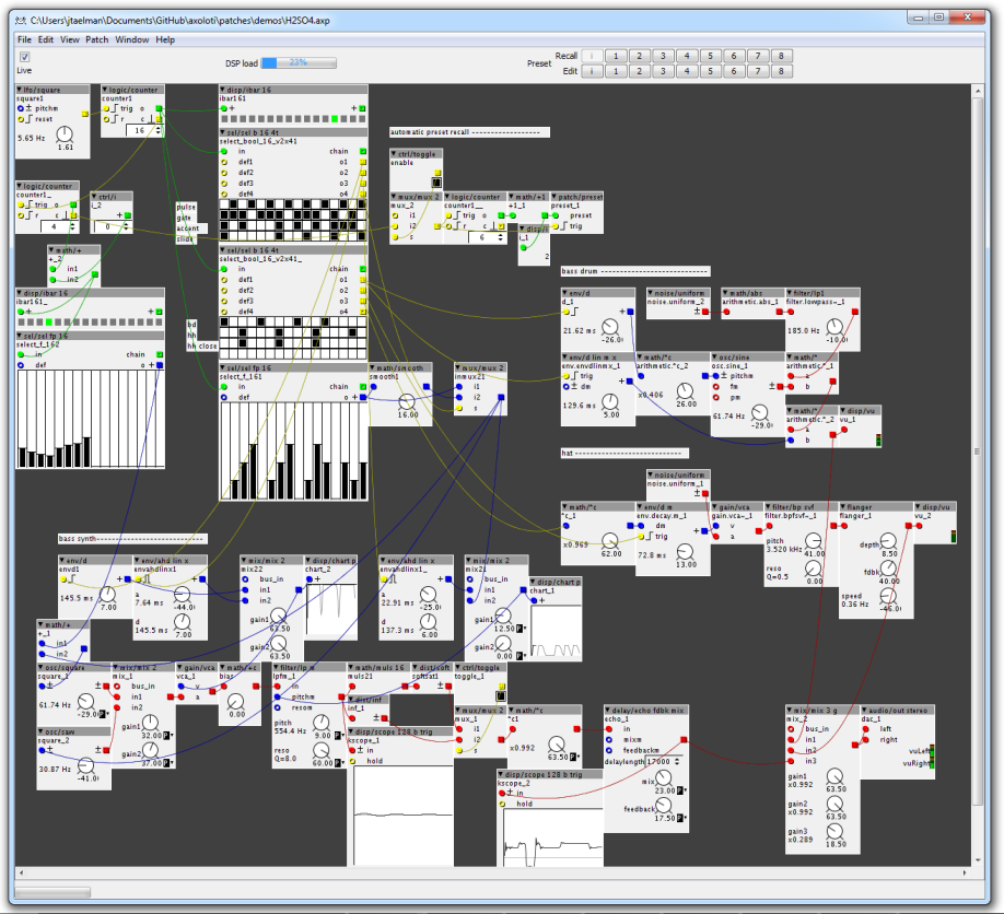 - The Axoloti Patcher is the software part of the system, with JAVA-coded GUI (the rest with C++), compatible with Windows, Mac OS X and Linux. The librarian and patcher is designed for patch and algorithms creating and editing as well as object compiling. It offers analog and digital audio inputs and outputs, LFOs, oscillators, envelopes, filters, MIDI, mixer, logical operators, delay lines, echo, various meters (VU, oscilloscope, spectrum analyzer…), math operators and distortion