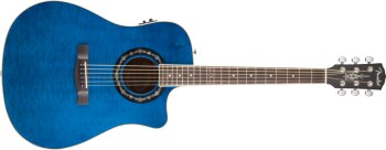 The T-Bucket 200CE has been slightly modified, with an additional Dot inlaid on the fretboard and a new Fender logo on the 12th fret. Transparent Black finish and specifications remain unchanged. MSRP is $449.99.
