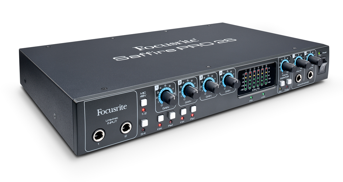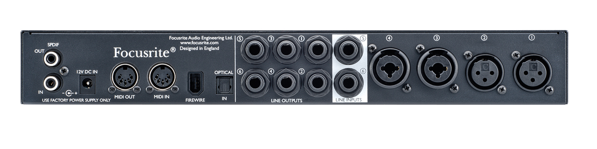 The Focusrite Saffire Pro 26 retains the desktop design of the Saffire Pro 24/DSP, among others, but unlike its siblings, XLR/jack combo inputs were placed on the rear, and replaced on the front with two 1/4” jack line inputs. The power switch has also been moved to the front.