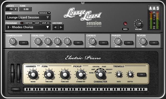 Here’s an example of the Rhodes (from Lounge Lizard SONAR), first without any processing, and then going through the Analog TrackBox channel strip.