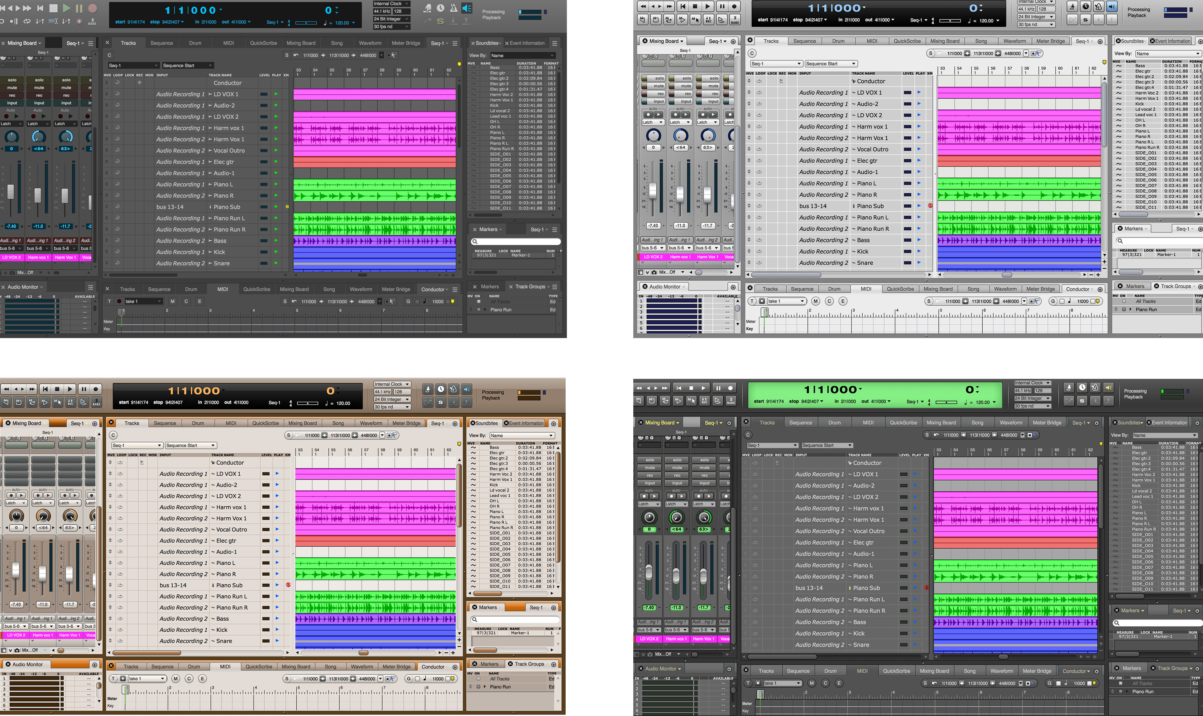 Many DAWs, let choose from a list of different “skins” (aka “themes”) to easily change their entire look. MOTU Digital Performer offers a whopping 30 different themes. In PreSonus Studio One 3's Appearance preferences window, you can choose preset themes and/or adjust the colors yourself.