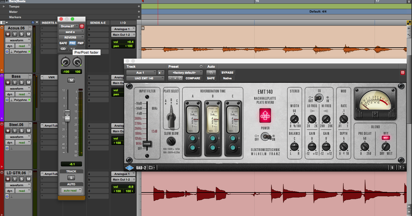 If you take the pre-fader route, any changes in level you make on the source track via the channel’s volume fader will not affect the reverb signal. In fact, the latter will remain constant with regards to the Send level, since it is the only control determining the amount of signal sent to the aux bus. If you were to use automation on the track’s volume, for instance, the reverb level would remain the same, which would entail a change in ratio between the source and reverb signal in favor of the latter. This isn’t necessarily a bad thing, quite the contrary! That said, it’s something you definitely have to be aware of to avoid ugly surprises. Along the same lines, if you tweak the pan pot of the track, it won’t have any effect on the reverb signal, since a pre-fader send is also pre-pan.