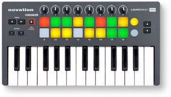 The Novation Launchkey Mini offers mini-keys, 16 pads, and 8 knobs, all in a very compact footprint.