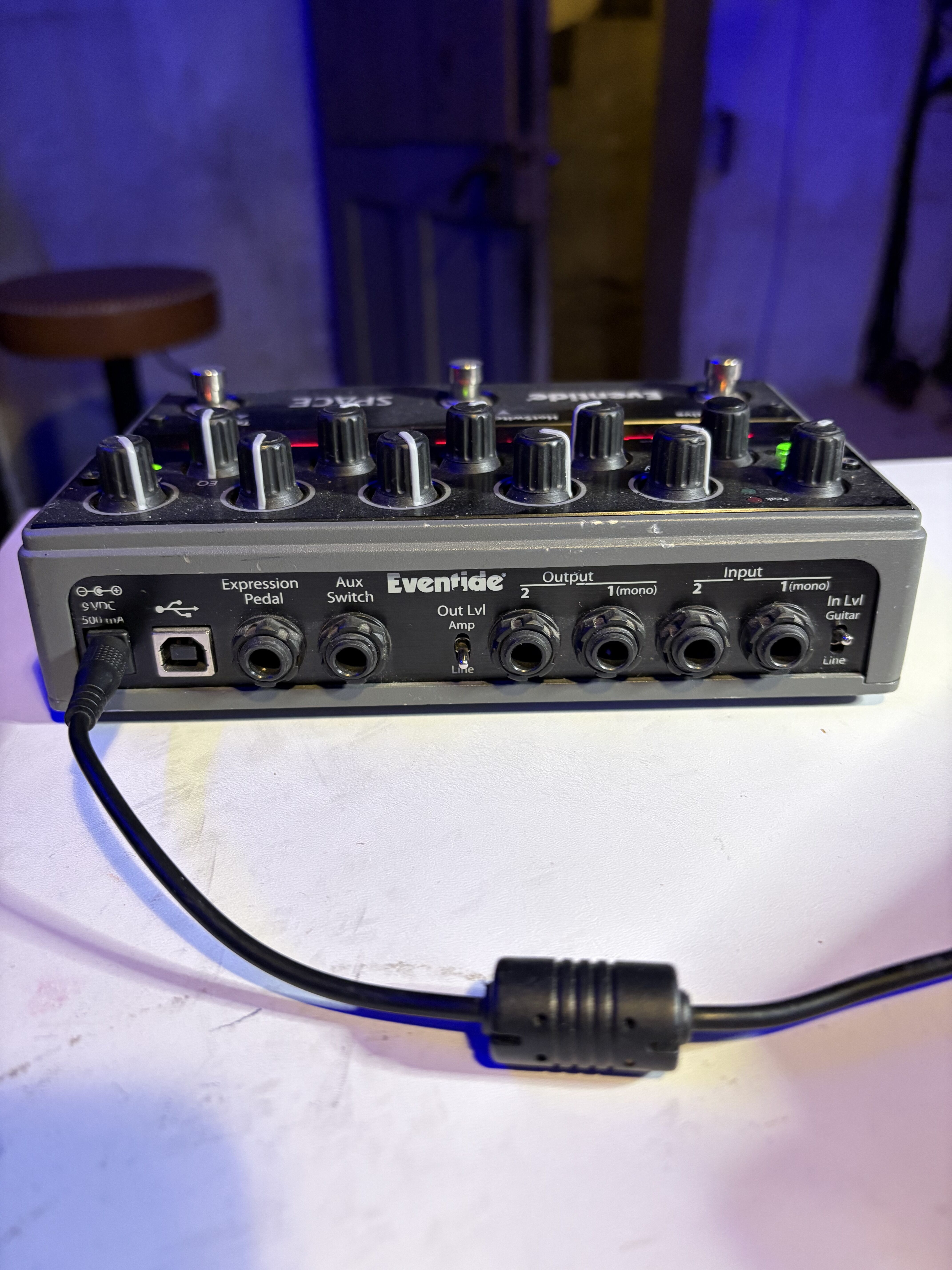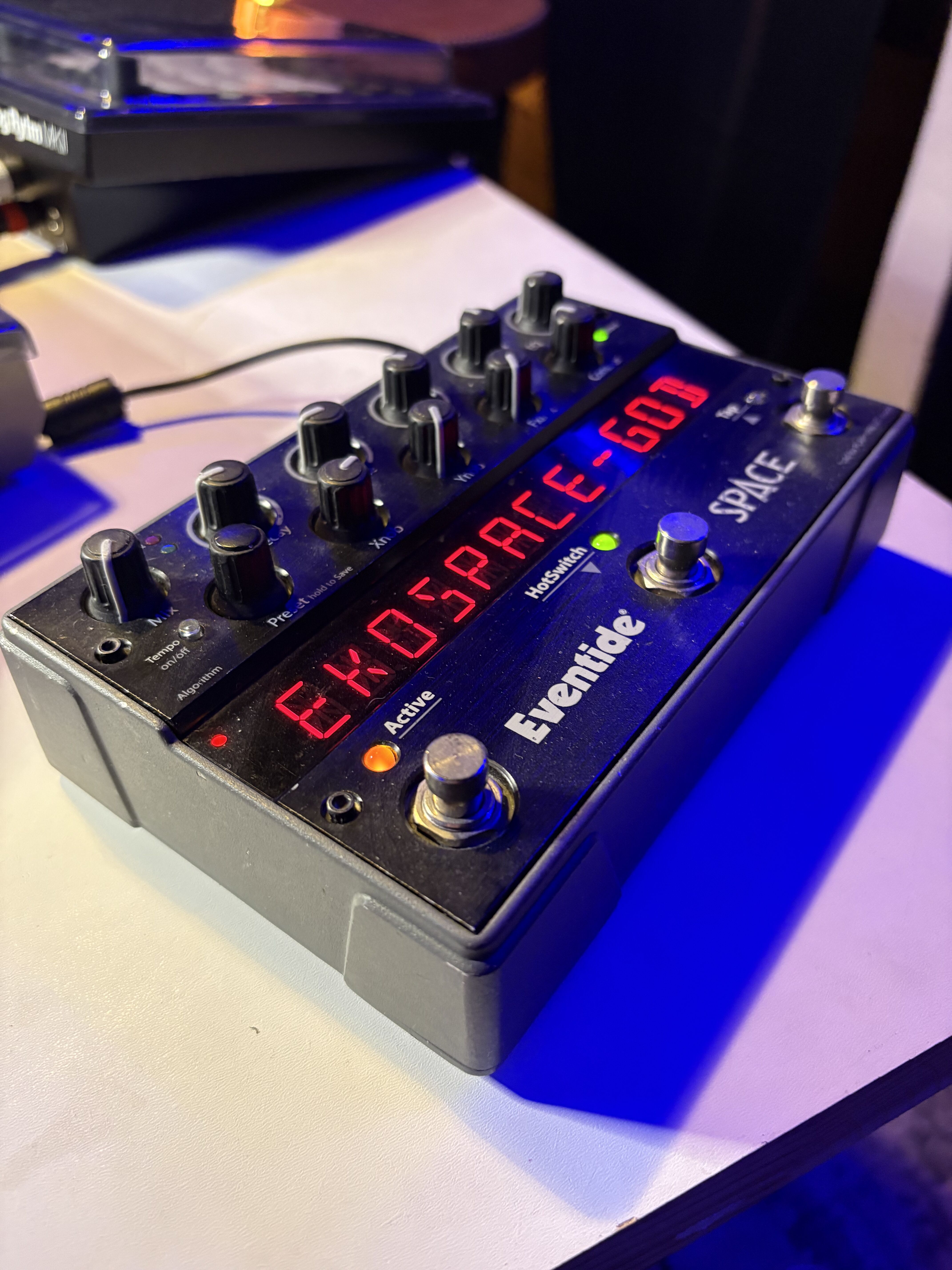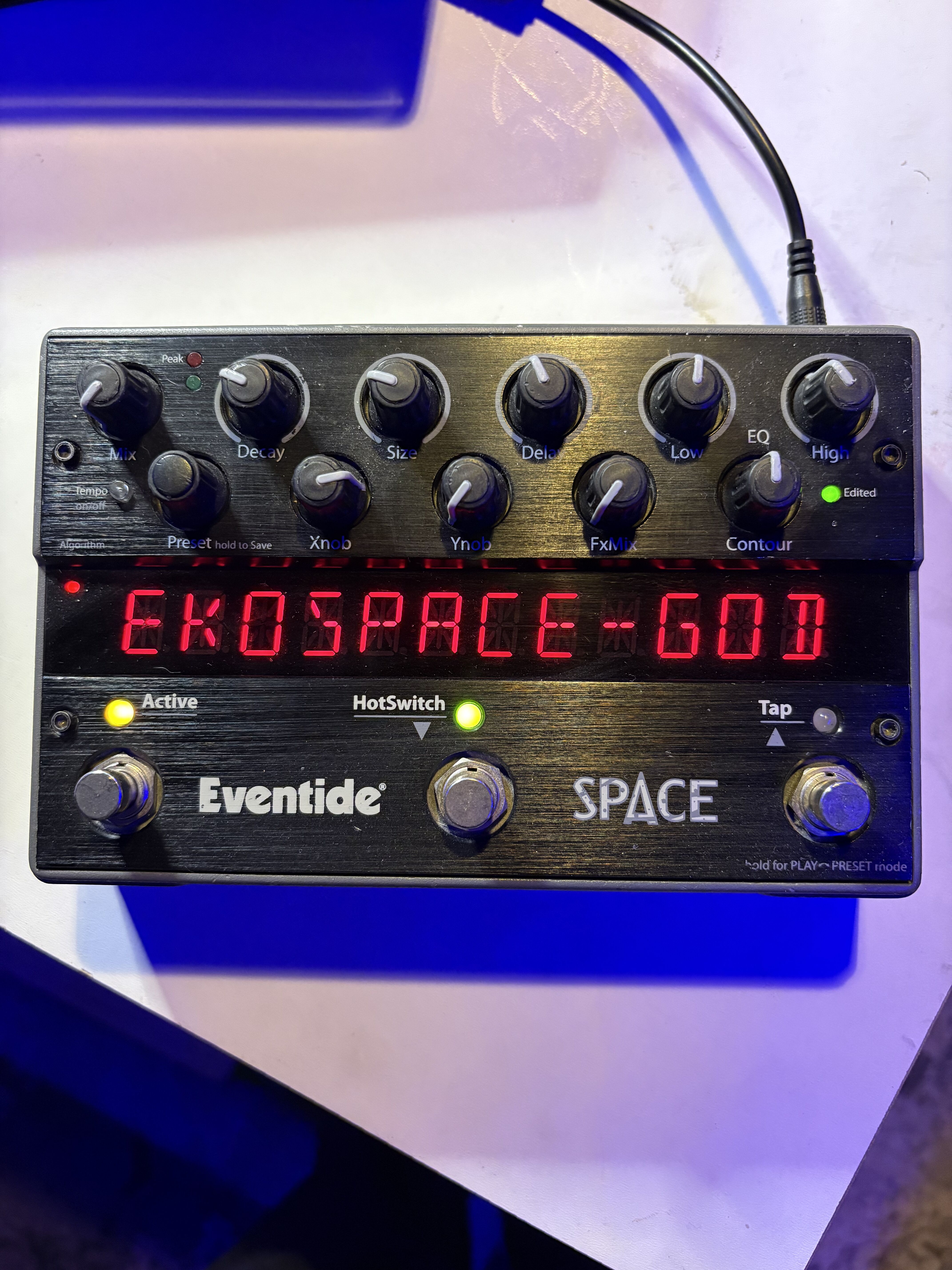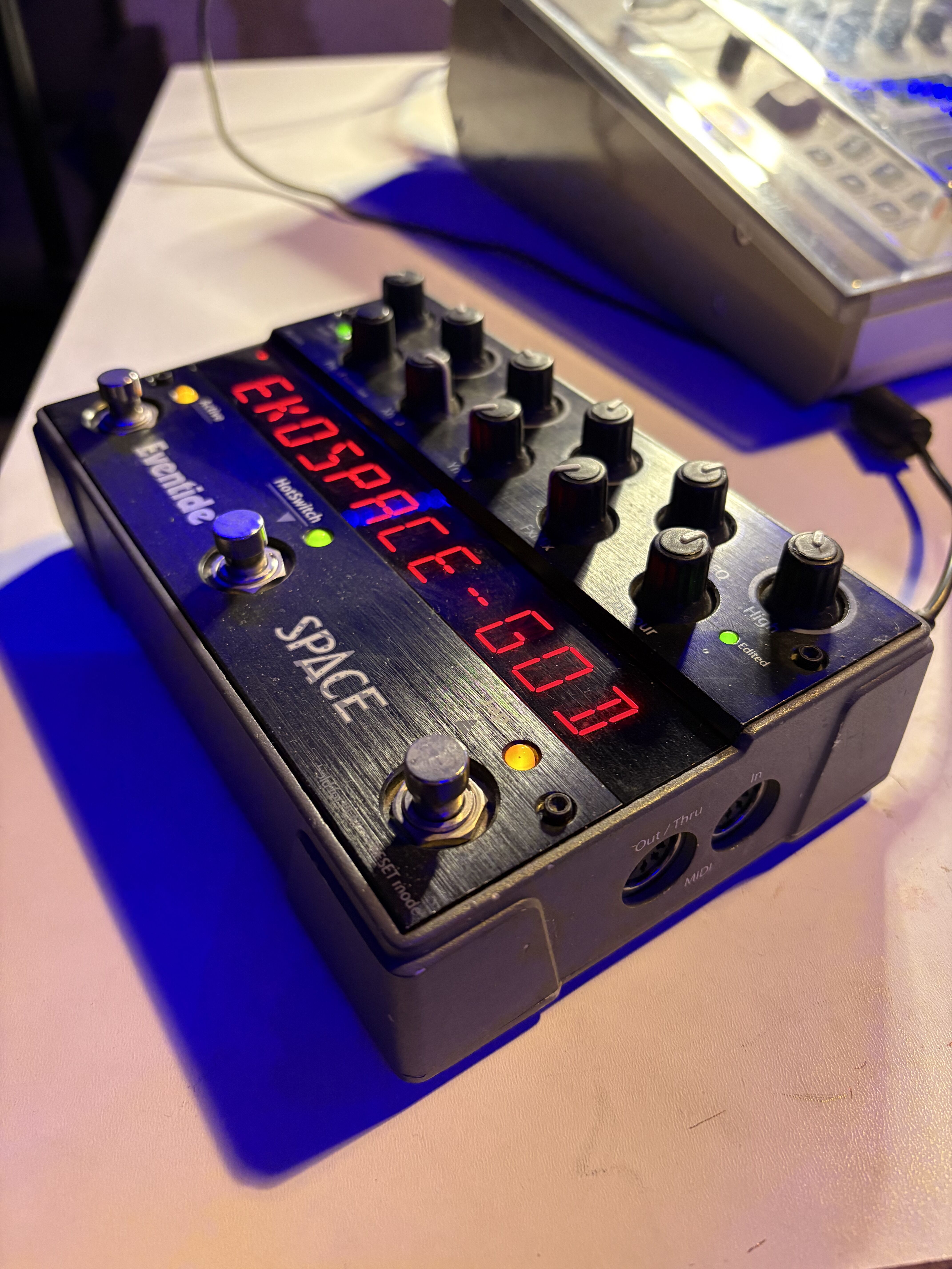 Published on 05/23/12 at 23:01The Eventide Space is a reverb effects stomp box that has more features and capabilities than you can possibly imagine! Loaded with 12 reverb algorithms, including the famed BlackHole reverb, standards like Plate and Hall, and with oddities such as Reverse and Shimmer. It is fully capable of stereo input and output, which makes it perfect for studio use. It is software upgradable via USB, and it is fully controllable via midi, and it is also controllable with external footswitches. It is capable of saving presets, but the presets cannot be saves or transferred to the computer via the USB connection.