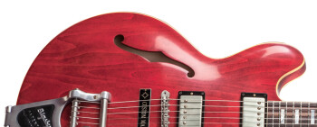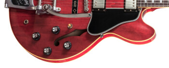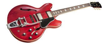 The Gibson Rich Robinson ES-335 is inspired by the semi-hollow models of the early 60s, with its “small block” design, its PAF-type tones, its Bigsby vibrato and Faded Cherry finish.