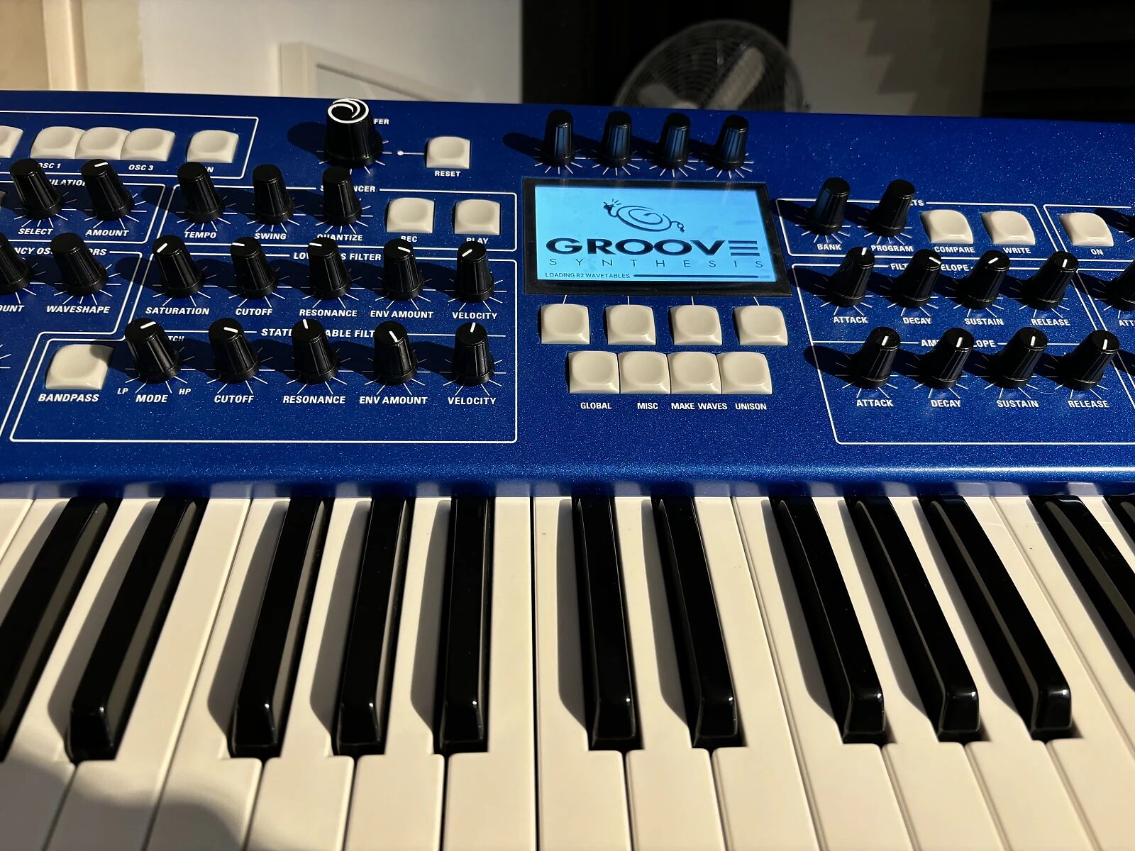 Il s’agit du modèle complet 61 touches avec panneau bleu, doté d’un clavier FATAR sensible à la vélocité et à l’aftertouch.