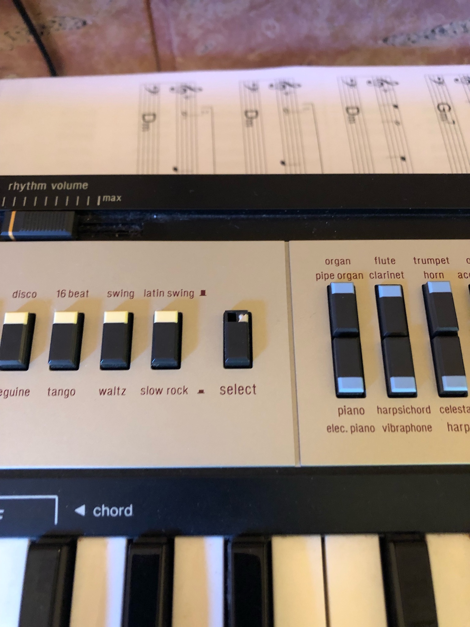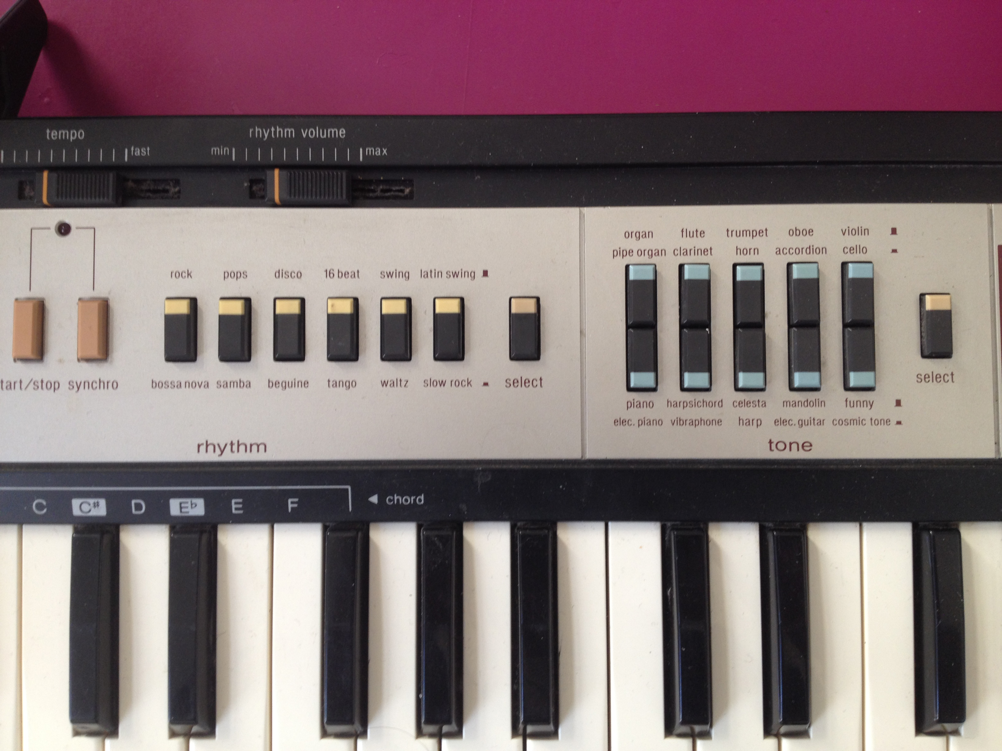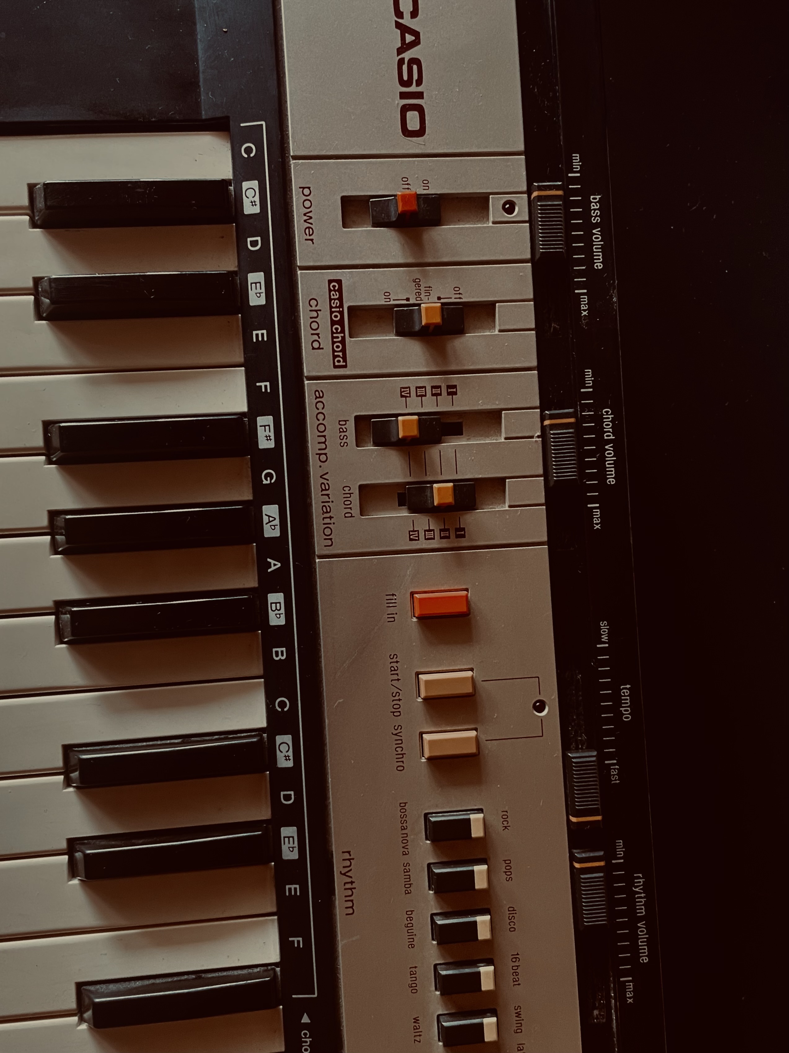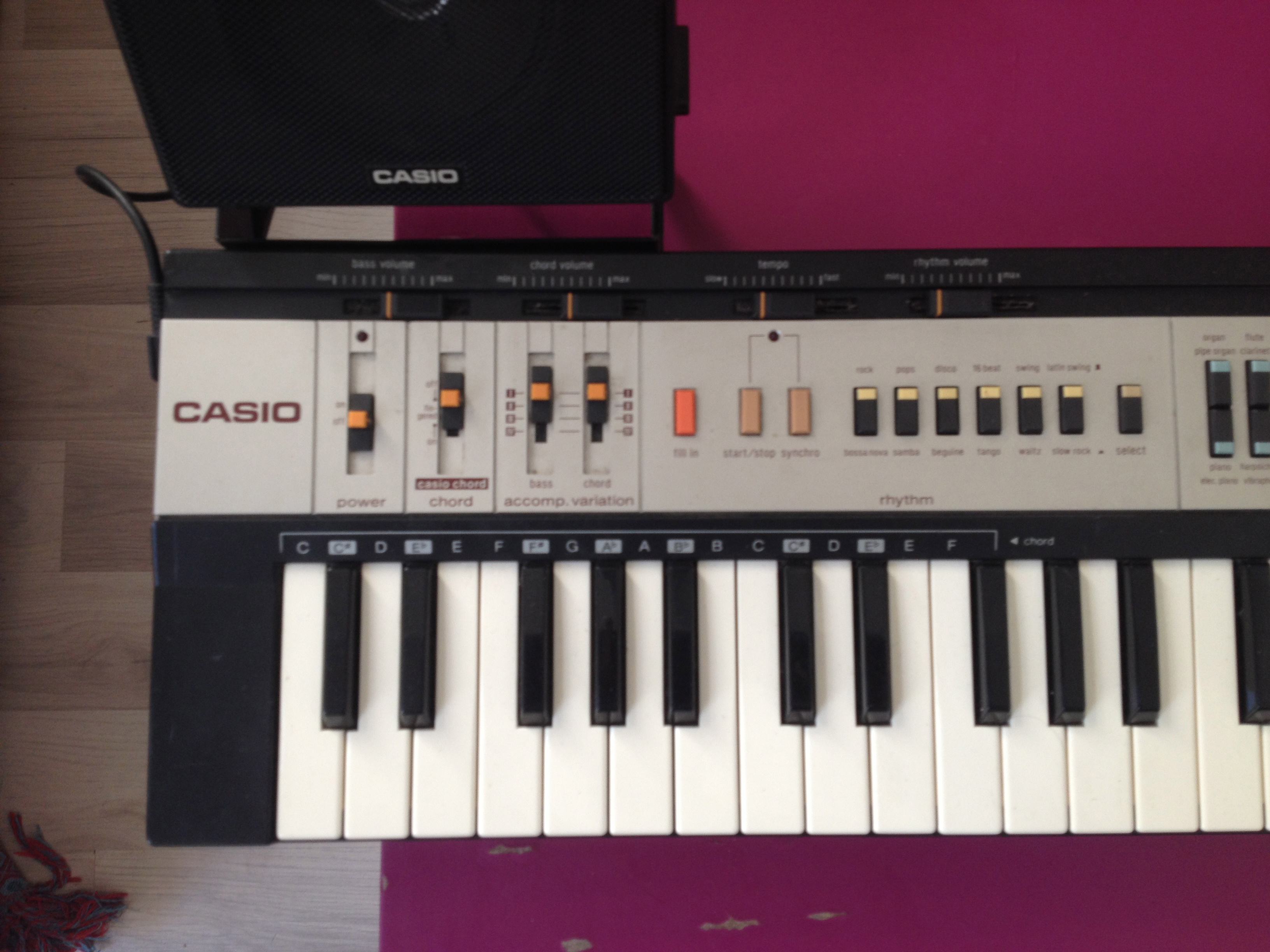 20 sounds, ditables via the analog filter and effects (non adjustable vibrato, rverb, sustain, chorus Stereo, waw - a kind of wah wah or plutt trmolo + 12 rhythms for rhythm box (analog sr good!) and support casio chord is trs-kitsch (4 variations for low and 4 for each of the agreements rhythms).