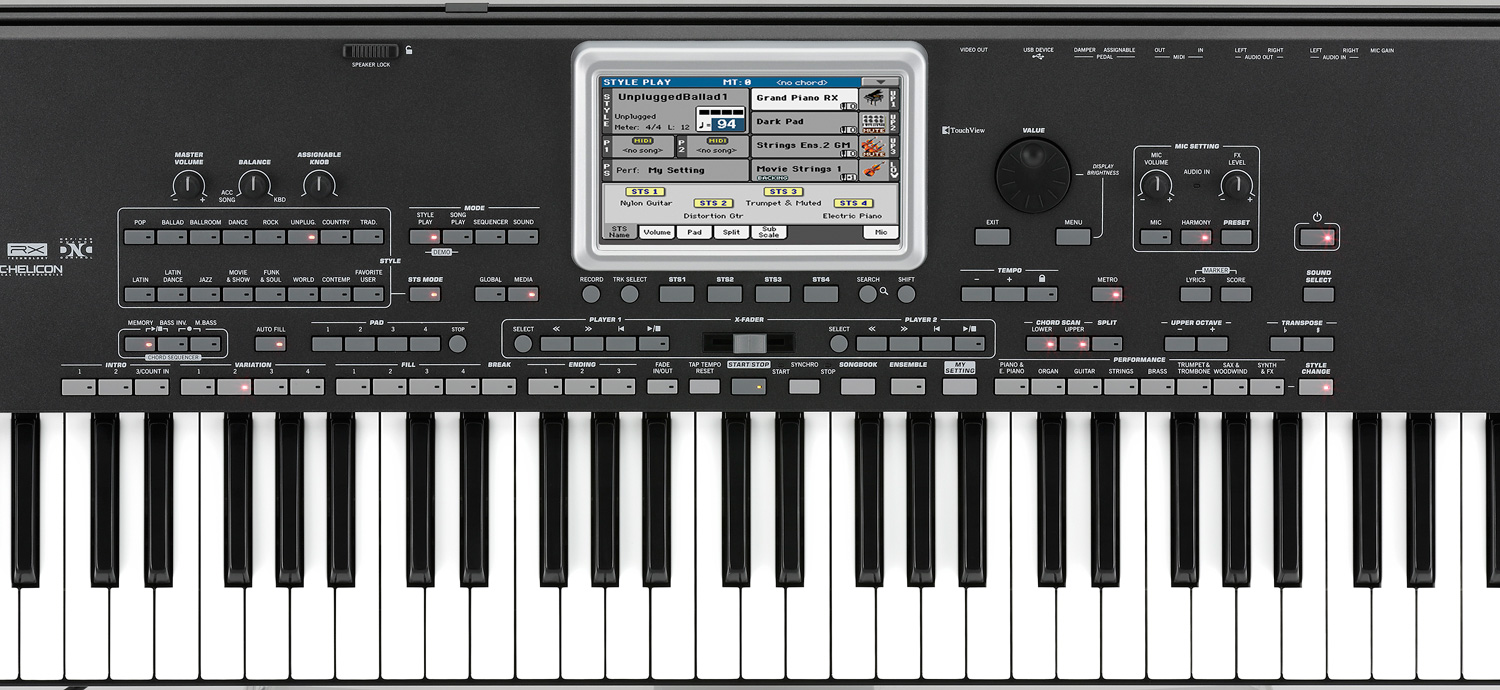 - Controls: global volume, fade in/out, ensemble, octave transpose, Master transpose, Keyboard Acc/Song Balance volume, style change, STS, mic volume, effect volume, mic on/off and preset, harmonizer on/off, tempo +/- and tempo lock, search, shift, chord scan, split, sound select