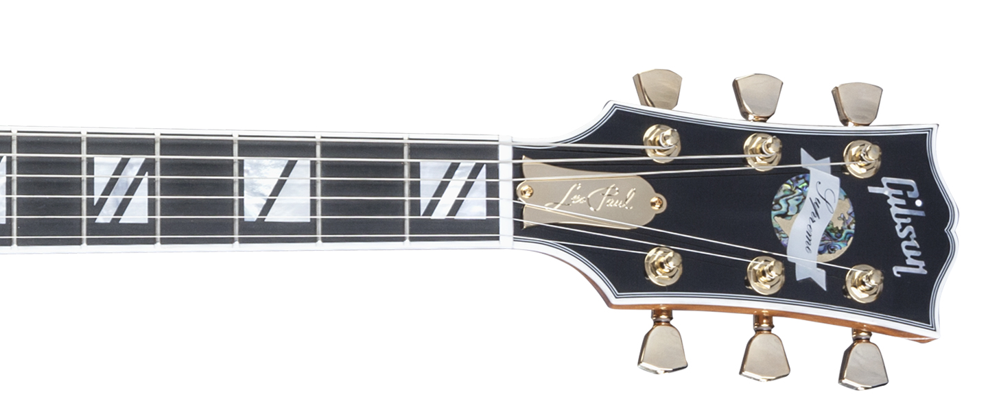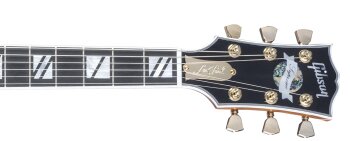 - Black headstock with Gibson logo and pearl Supreme decal, « Les Paul » engraved truss rod, multiply binding