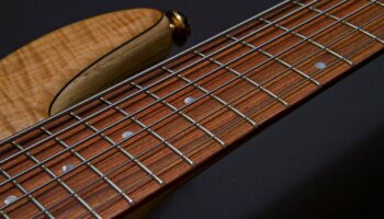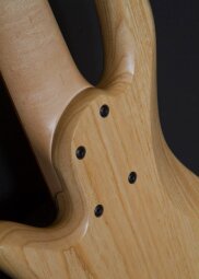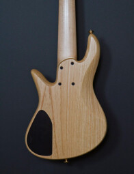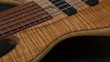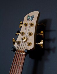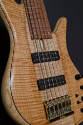 It features a two-tone flame maple top on an ash body with a 34" scale one-piece quartersawn, hard-rock maple neck and Pau Ferro fingerboard with mother-of-pearl dot Inlays. The E6S has a bolt-on construction and is equipped with Fodera dual-coil pickups and Fodera / Pope Standard 3-band preamp.