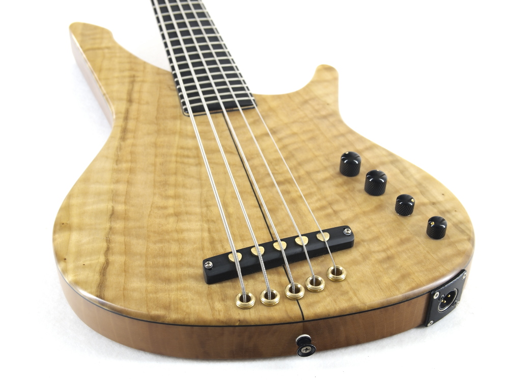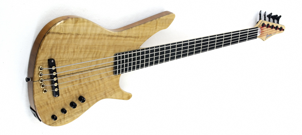 The new Woody Phantom is a mix between a Satin Special 5, with burl poplar top, sycamore body and satin finish, and the Woody series designed for Daniele Camarda for the electronics. The latter includes passive volume and tone knob to adjust the built-in piezo, a passive filter with a load resistance control and a 6-way rotary selector for the bass cut condenser.