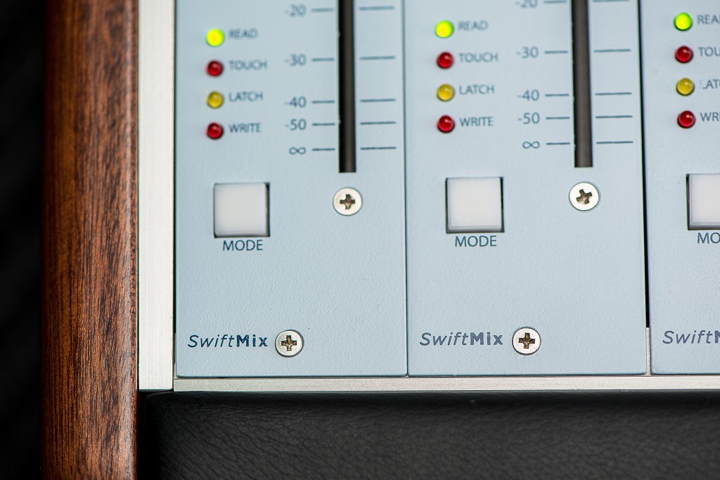 Each SwiftMix channel strip features a 100mm motorized fader, five backlit switches to control the DAW channel select, solo, mute, recording arming and automation. The automation mode offers Off, Read, Touch, Latch and Write options, each visually indicated by a LED on the SwiftMix.