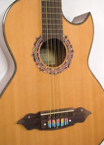 Lucida Bajo Quintos feature solid spruce tops, mahogany backs, sides, and necks, rosewood bridges and fretboards, abalone and fiber rosettes, and 3-ply body binding. The Bajo Quintos have classic cutaway designs to allow access to the upper frets, and are strung with Mexican Mariachi strings.