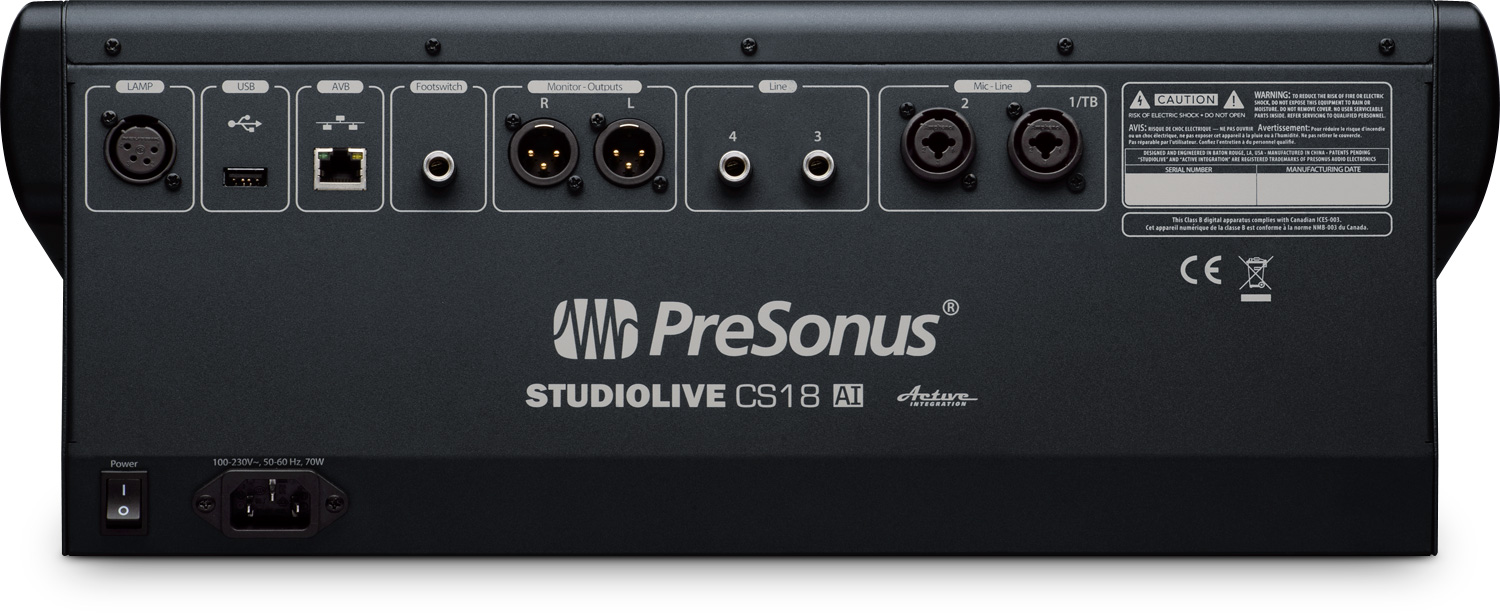 Along with the AVB Ethernet connection, the StudioLive CS18AI features two microphone inputs with XMAX preamps and two TRS line inputs for talkback or 2-track direct playback. Two digital return channels of the RM mixers can also transport the Solo bus, main mix and any aux mix signals to feed the two TRS headphone and monitor outputs.