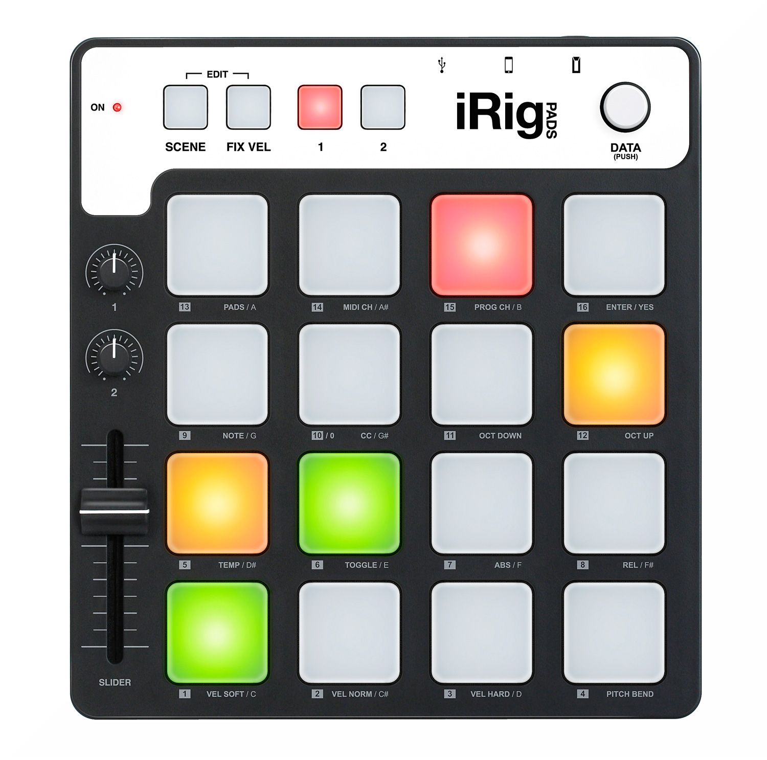 It features 16 multicolor backlit pads, 2 knobs, 2 buttons, 1 slider and a push rotary encoder. The iRig Pads ships with 6 pre-programmed scenes that are compatible with different apps and software but you can store up to 16 mappings.