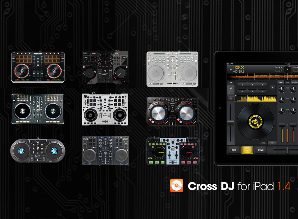 Thanks to the new built-in MIDi Control, Cross DJ v1.4 now allows, and for the first time, iPad users to control 8 popular hardware DJ controllers. Here is the list of the compatible gear (requires the Apple USB Camera Kit):