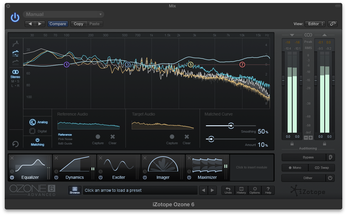 On some match EQ’s you’ll find a color-coded spectrum analyzer display simultaneously showing the source and target EQ curves, and on some, the match curve, as well. Usually there’s a slider that lets you choose what percentage of the source profile you want to apply on the target, and on some EQs, such as the one on Ozone 6 (which is part of its regular EQ module). The next step is usually to set the parameters and then hit the Match or Process button that initiates the actual matching. You can then experiment with the settings until you get what you want. Many match EQs have a “smoothing” feature, which smoothes out the EQ curve used for the match, sometimes helping the matched file blend in better with the source.
