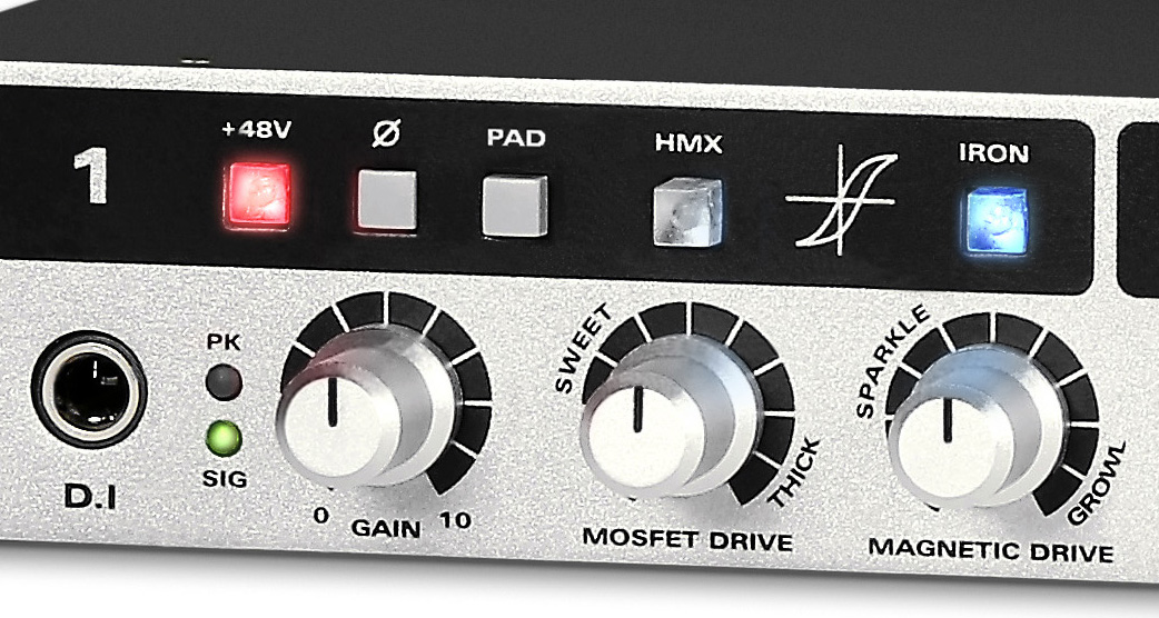 Each input channel has individual 48V phantom power switches and –15 dB pad switches plus gain knobs. Audient calls channels 1 and 2 the “Retro Channels, " because they’re equipped with two types of coloration circuitry (Dual Stage Color Saturation Controls) that can add vintage style sonics to the input . HMX is a tube emulation. IRON is a transformer-based circuit. When they’re off (both channel 1 and 2 have individual on off switches for the HMX and IRON features) the preamps are designed to be neutral.