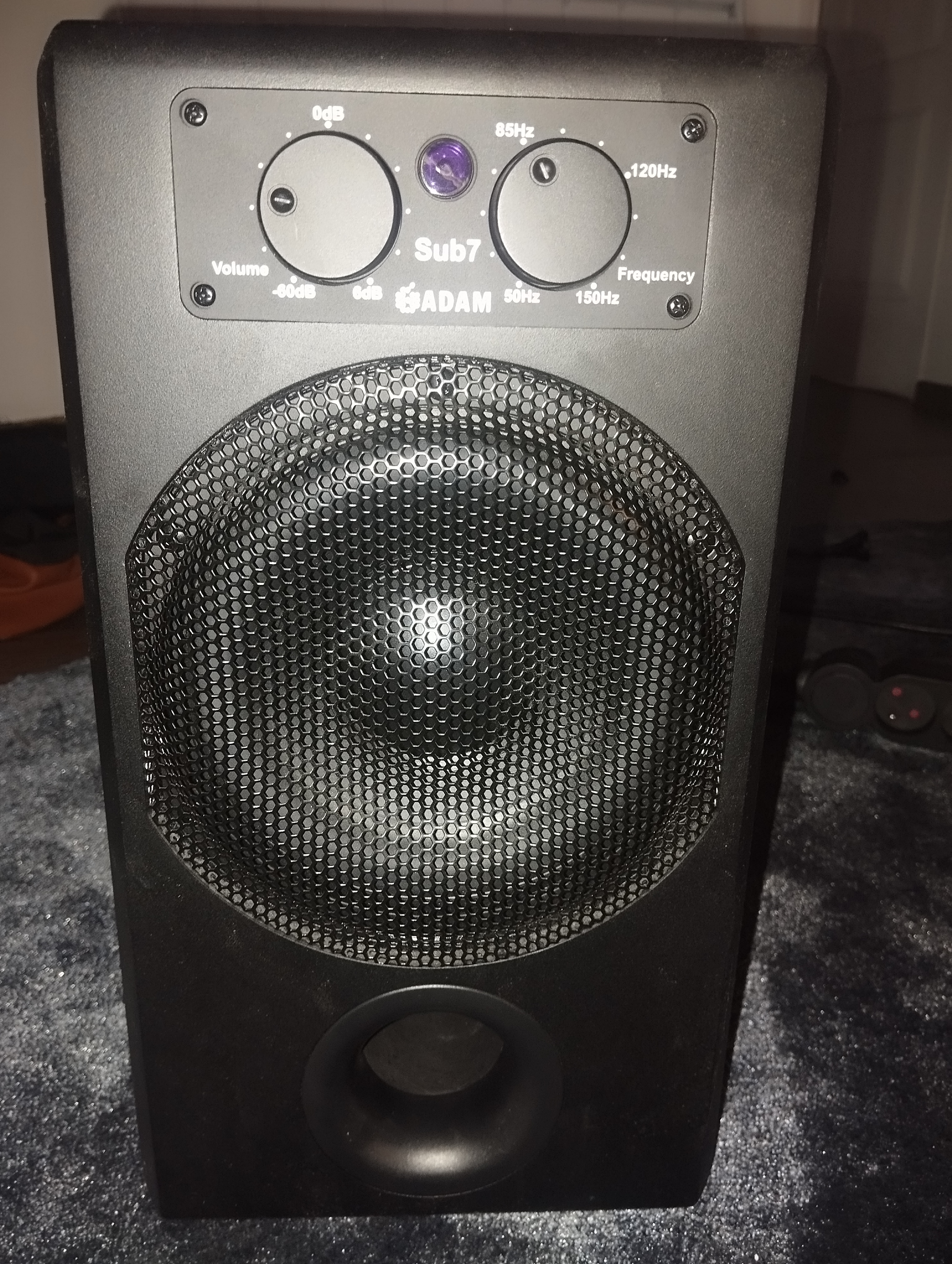 Published on 12/16/12 at 23:55The ADAM Sub 7 is an active bass speaker that has a 7 inch woofer. It comes with a wireless remote control which is very handy because usually you put your woofer under your workstation and with a remote that means you do not have to get down that every time you want to adjust it. On the front of the ADAM sub 7 it gives you two motorized knobs that let you change the input level and crossover frequency settings quickly. You can even use the wireless remote to change those options quickly as well.