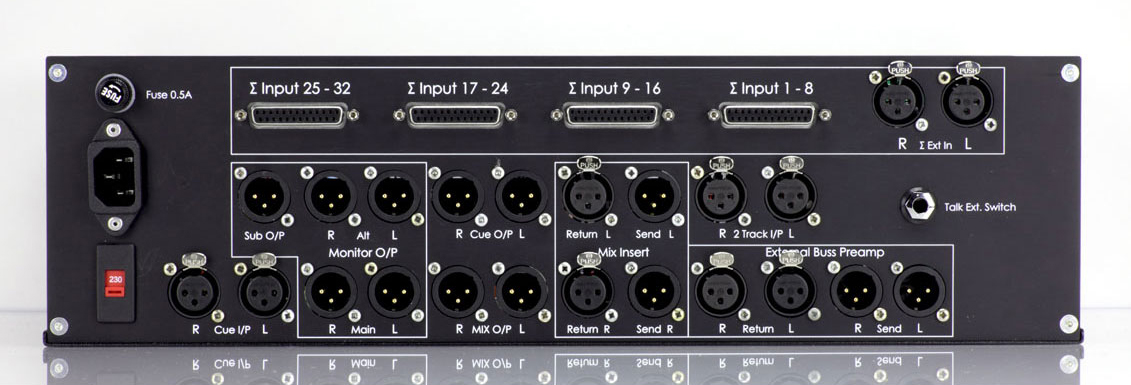 The Funky Junk 3202 is setup as a stereo summing mixer by default (channel 1 left, channel 2 right…), but the inputs 25 to 32 can be switched to mono. Plus, two XLR Ext In are included for chaining another 3202 or plug any external inputs. Inputs 1–32 are spread on 4 D-Sub 25 connectors. The rest of the connectors are XLR, except for the headphone output which is a 1/4" jack.