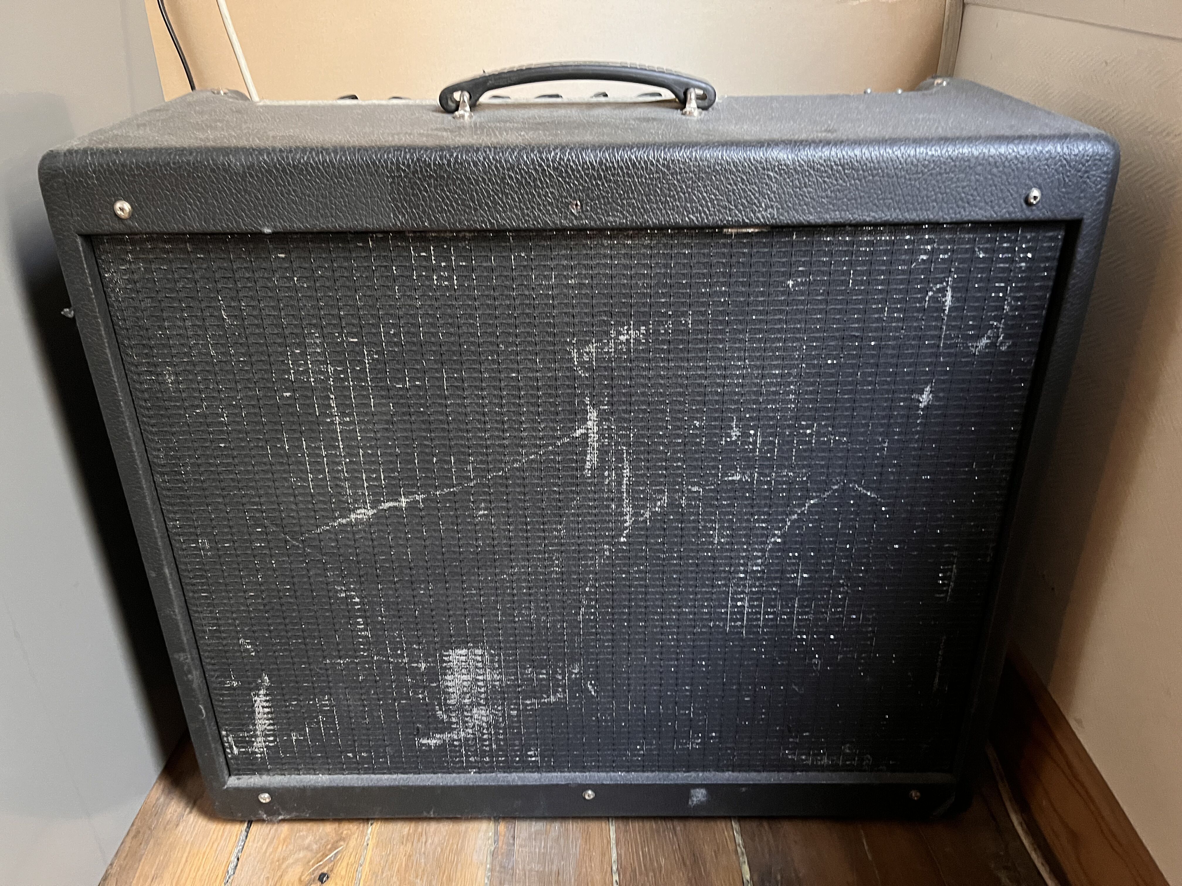 Amp covering/grille cloth: Textured black-vinyl covering with "Blackface"-style black/silver grille cloth