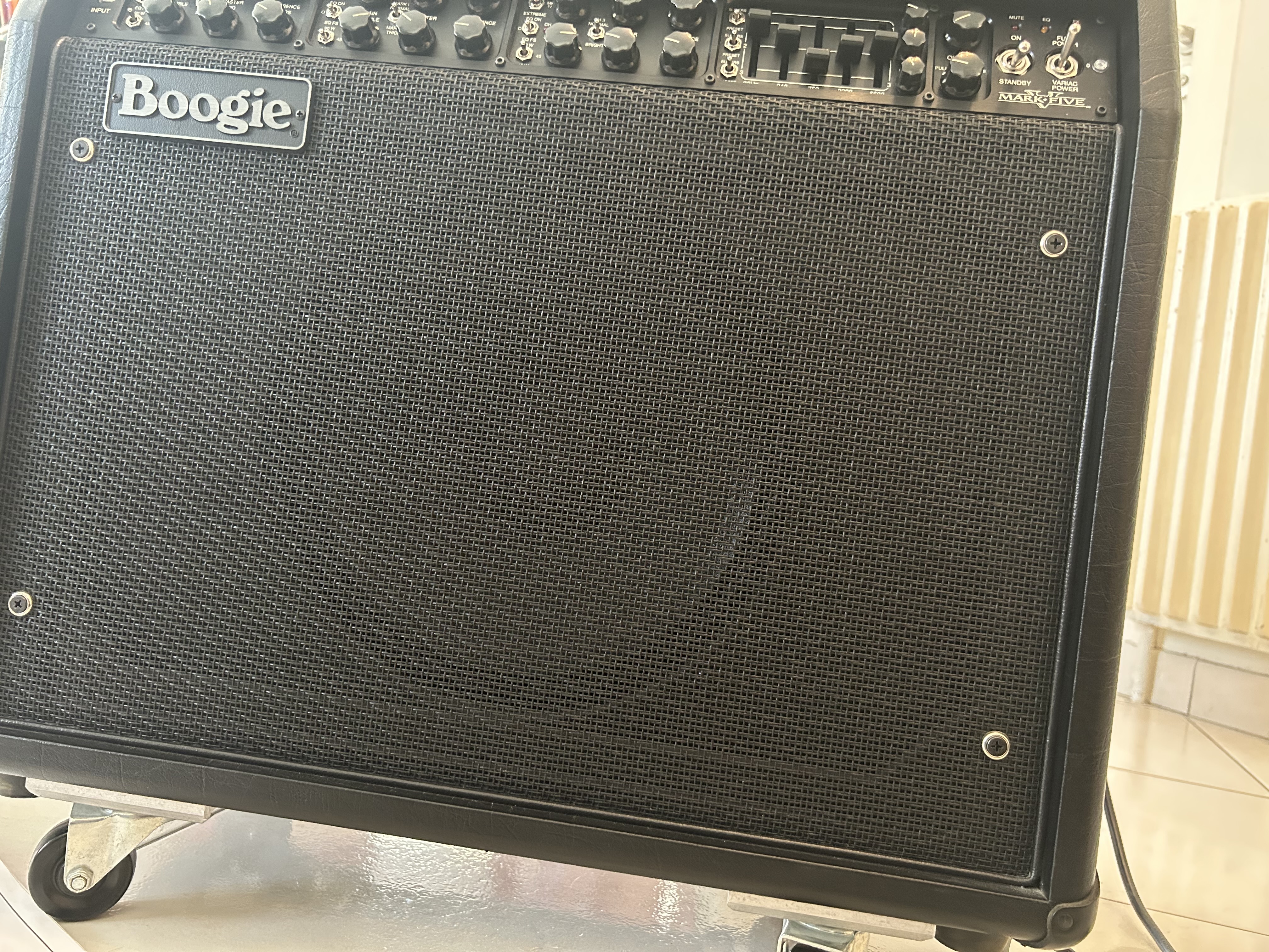 Published on 05/07/12 at 11:05Mesa Boogie Mark V. All tube preamp and 4 power tubes, simulclass so it can be 4x6L6 or 2x6L6 and 2xEL34. 3 channels, 3 modes to each channel, switchable 90/45/10 watts, full power and variac power switch, individual channel EQ as well as programmable graphic EQ for each channel. Individual channel reverb, tube or transistor rectifier, pentode or triode switching for the lead channel, all controllable via midi foot switch (included). This amp can replace an entire rack of amps and EQ's. It's just amazing all the things they put into this and still made it cheaper than other boutique style amps. Made here in the USA in California.