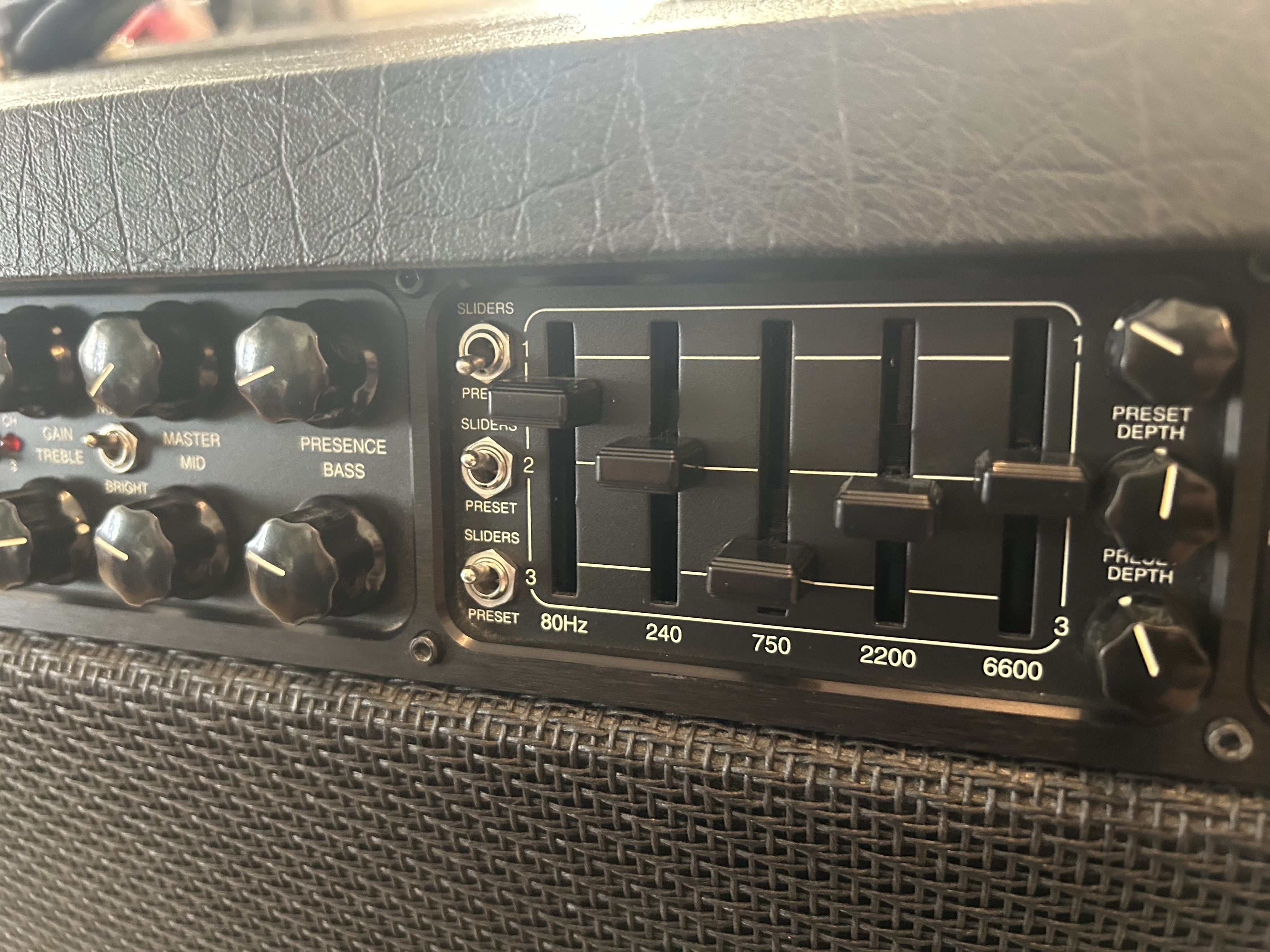 There is a somewhat daunting number of controls on this amp, all intended to provide the ultimate in tonal flexibility. However, just imagine that there are so many controls on the front panel that they have to put the reverb and triode/pentode switches on the back. Each channel has three modes to choose from and are foot-switchable, as is the effects loop, reverb, EQ, amp mute, and solo boost. This makes for a larger than normal 8-button foot switch, but it is easily stored in the back of the combo (once you learn the trick). You can only pick from one of the modes for each channel, selectable by a mini-toggle switch on the front of the amp. Also present is the familiar Mark Series 5-band graphic EQ on the front.