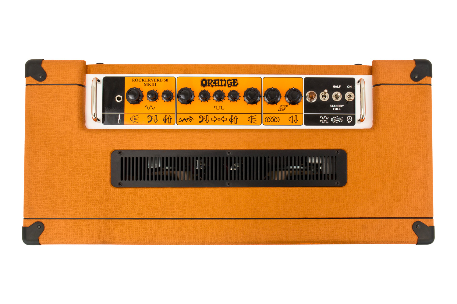 The Rockerverb mkIII are available in black and orange finishes, the heads feature a white, black and orange control plate.