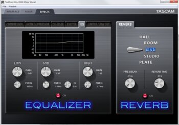 - DSP effect processor can be applied to inputs, outputs or master (compressor, noise supressor, de-esser, exciter, EQ, limiter/low-cut)