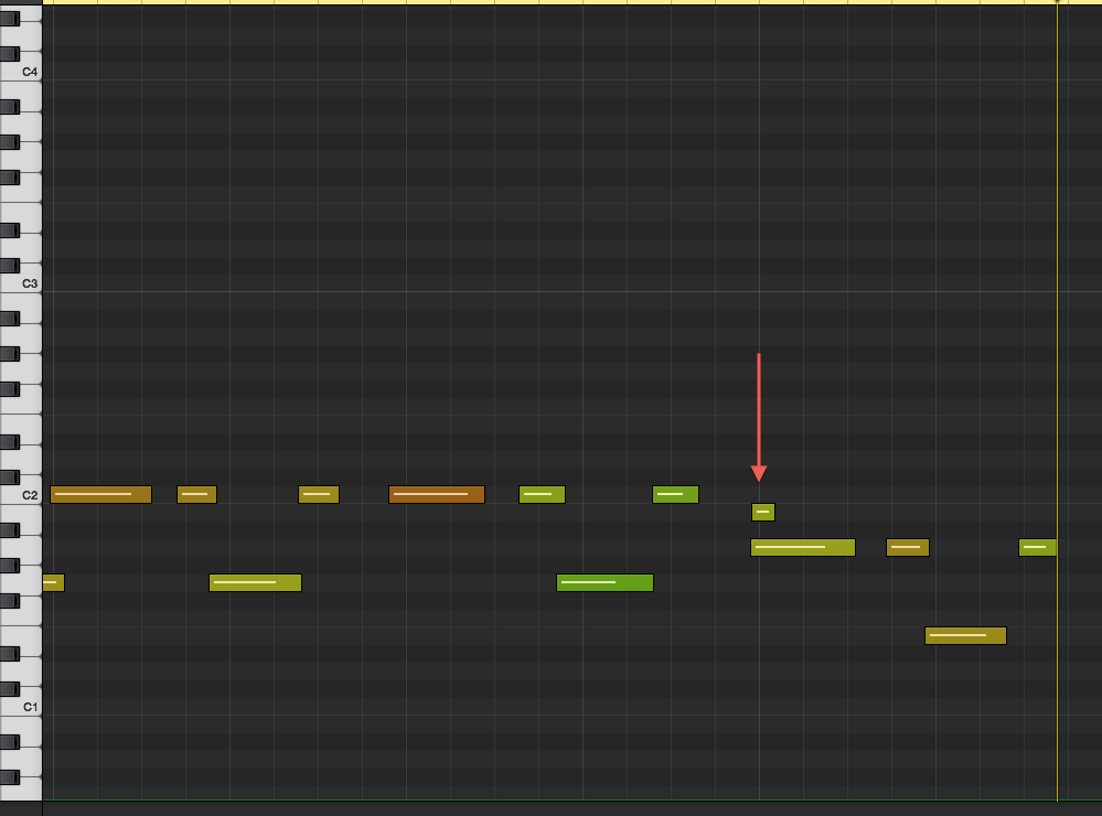 If you’re trying to sound like a bassist, rather than a computer, you should try to play in your bass parts on your MIDI keyboard, rather than programming them into your DAW. Once you’ve played in either a full song or a specific section, open it up in your piano roll editor and fix any bad notes you find. It’s easy to accidentally trigger additional notes beyond what you were trying to play, which you’ll see in your editor typically as small notes above or below the desired note. Delete these extraneous notes and durations that don’t sound right (including unintended overlaps).