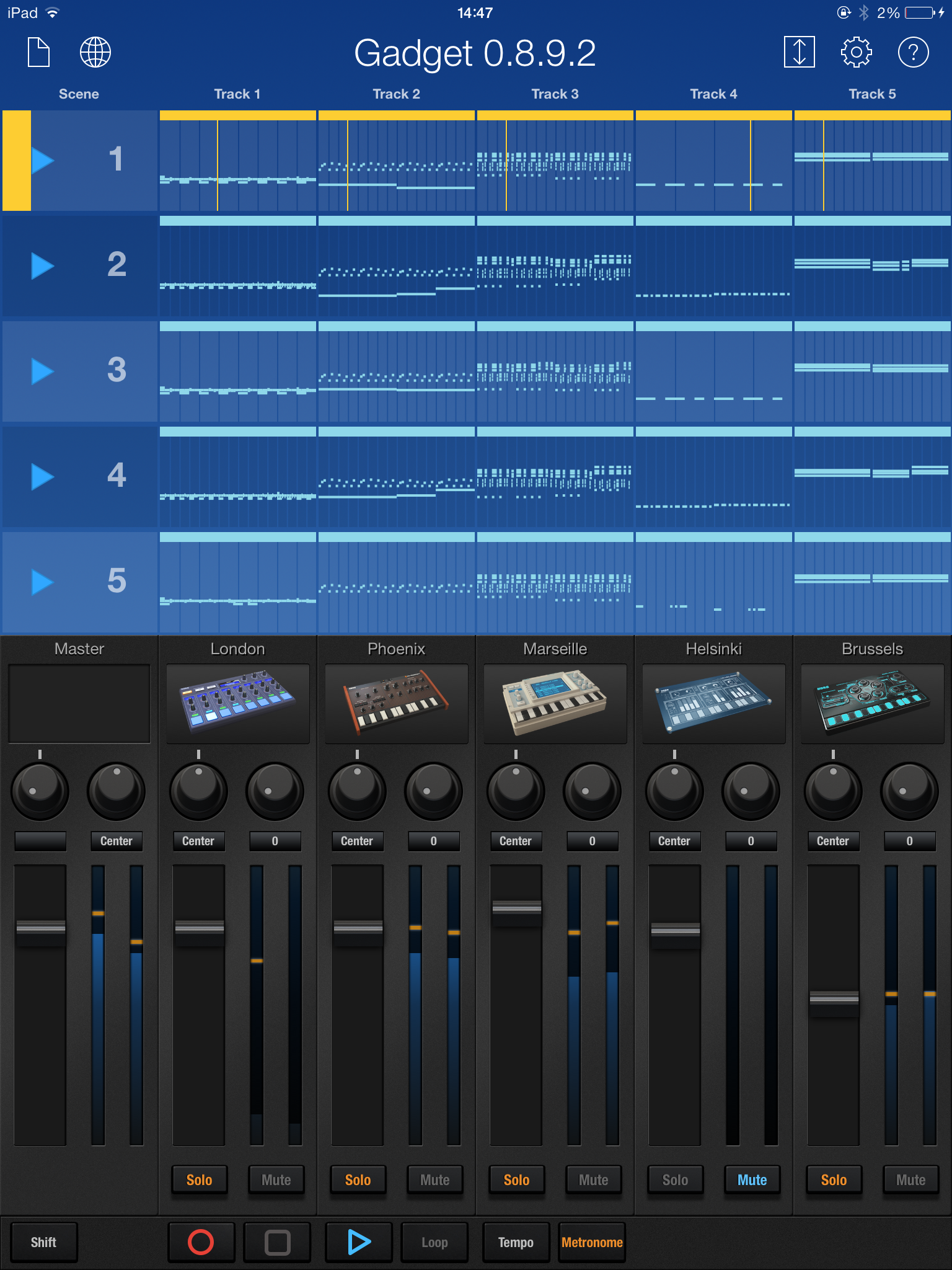 With Gadget, you can free combine any of the 15 virtual instruments to create electronic music. Depending on your iDevice, you will be able to use up to 20 instruments simultaneously (and almost the double with the Freeze feature enabled). Each synth and drum box offers easily-accessible parameters so that beginners can quickly start creating music.
