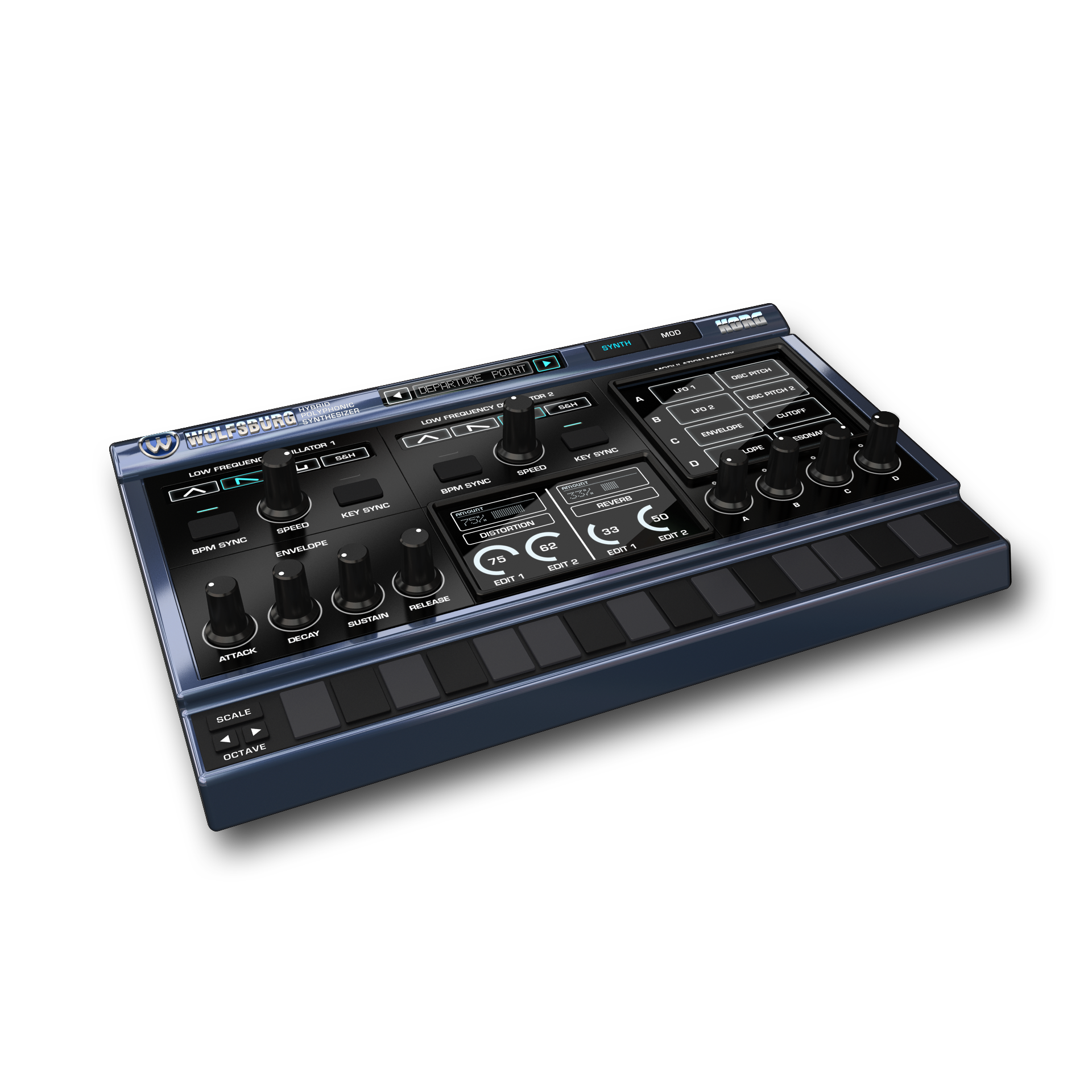- Wolfsburg: hybrid polyphonic synth with digitally resampled waveforms, two effect sections and four modulation matrix sections