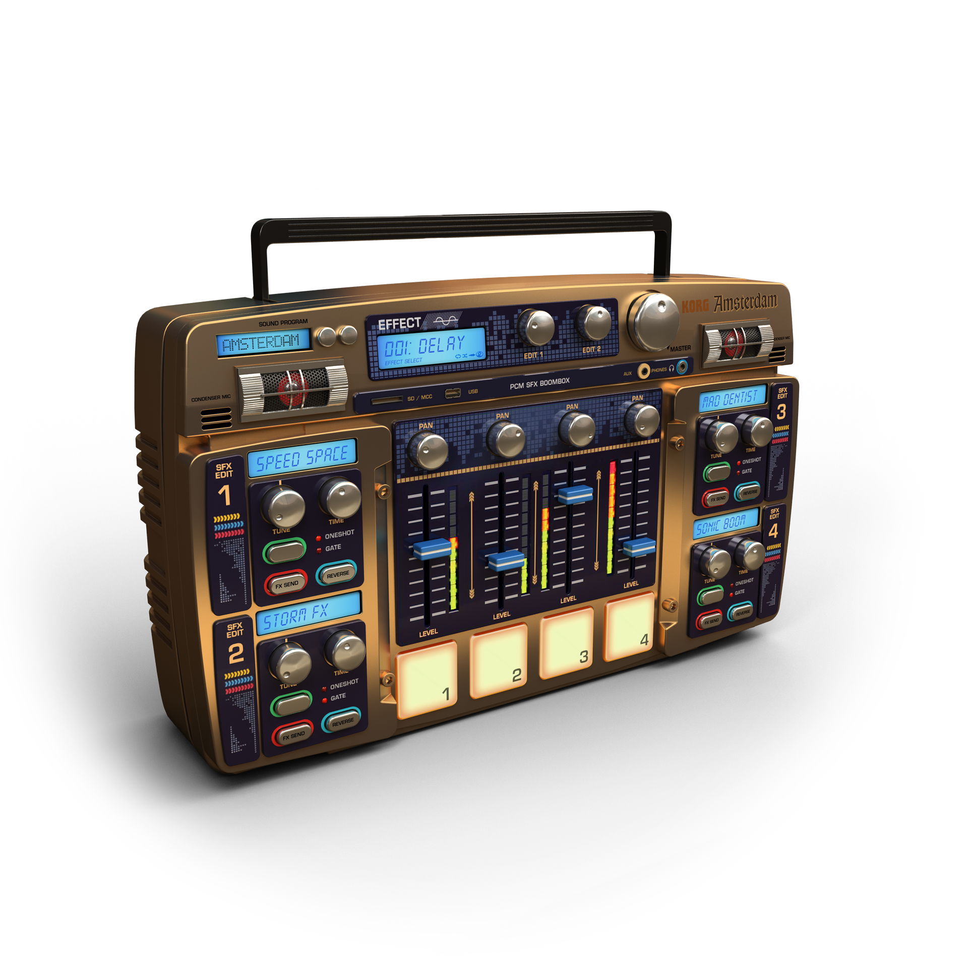 - Amsterdam: a 4-part PCM boombox with hundreds of sound effects and chord samples to create chord progressions
