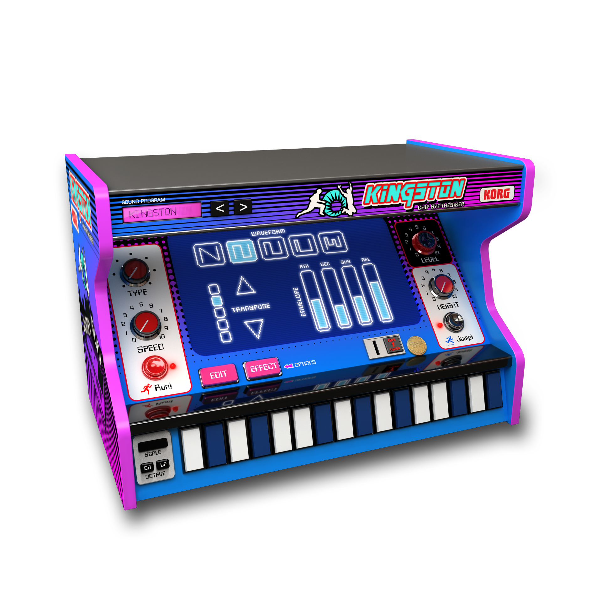 - Kingston: “cheap” polyphonic synth for 8-bit game sounds, with Jump and Run functions and effects to deform the sound