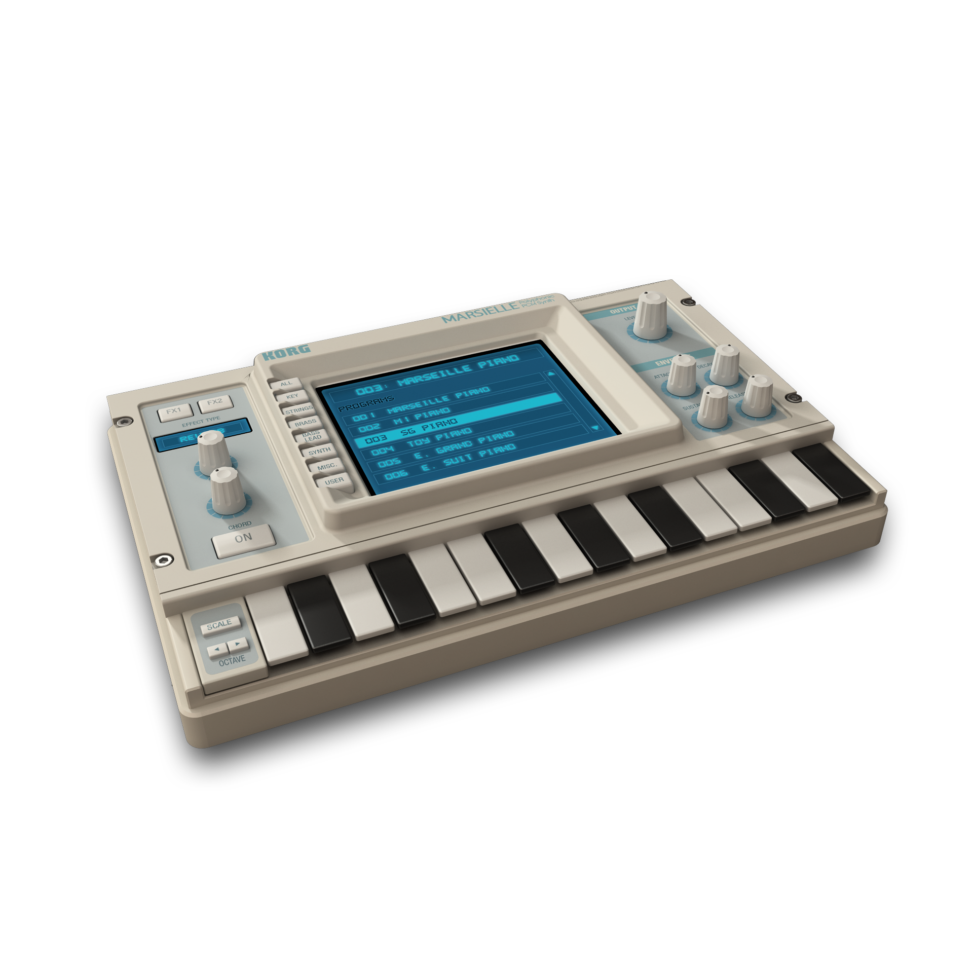 - Marseille: PCM polyphonic synth with keyboard, brass, strings and synth sounds, as well as a Chord function